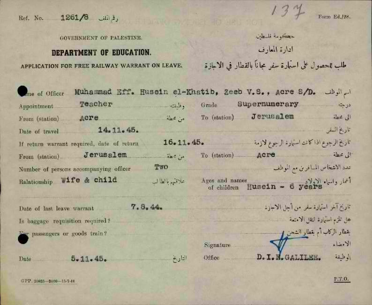 طلب استمارة سفر مقدمة من المعلم محمد الخطيب/كفر زيباد