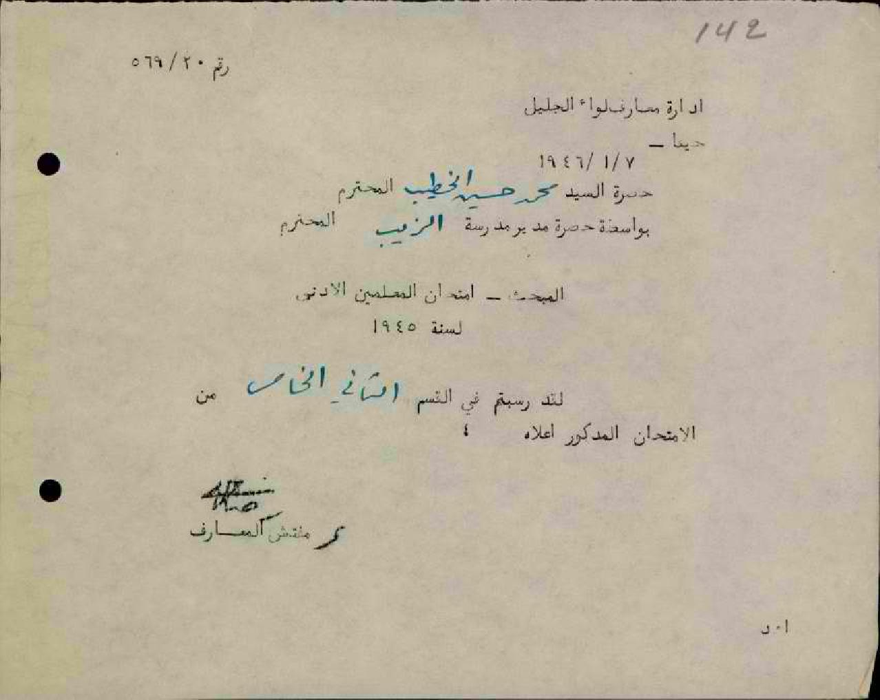 رسالة من مفتش المعارف الى المعلم محمد الخطيب بخصوص رسوبه في امتحان المعلمين الأدنى