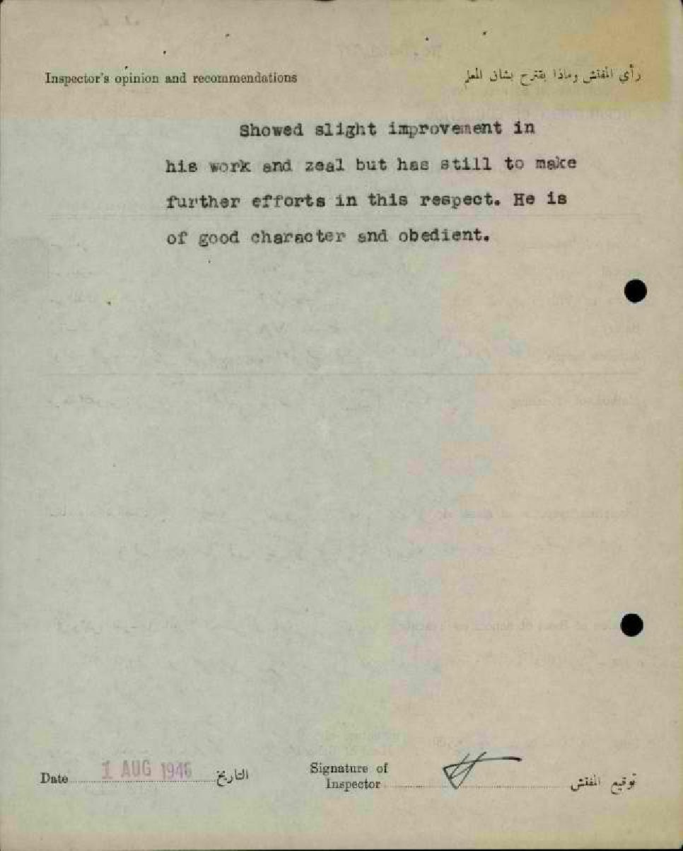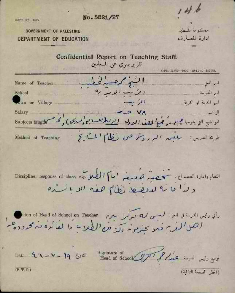 تقرير تفصيلي عن أداء المعلم محمد الخطيب في مدرسة الزيب سنة 1946