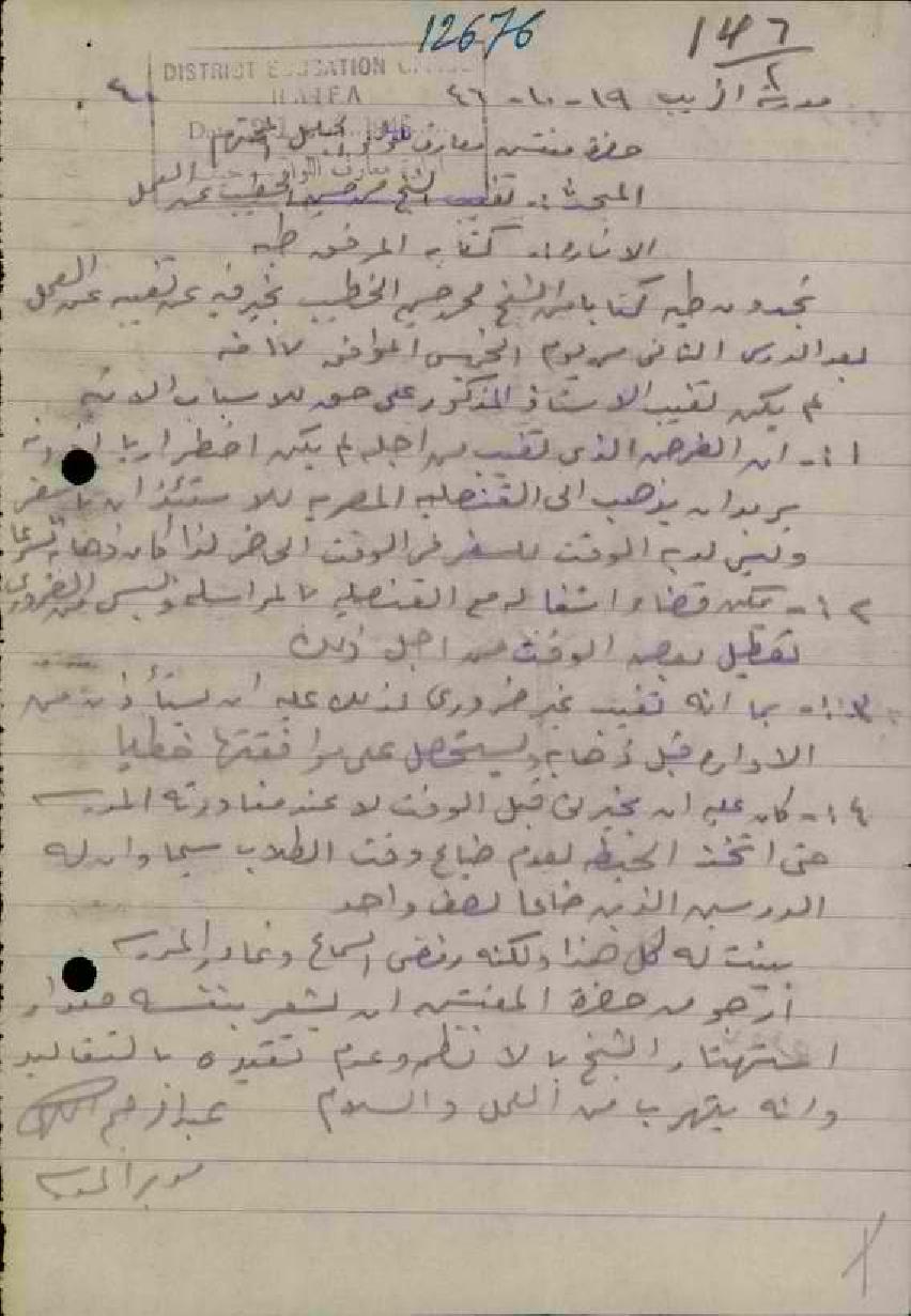 رسالة من مدير مدرسة الزيب الى مفتش المعارف مرفقة برسالة من المعلم محمد الخطيب بخصوص تغيبه عن المدرسة للذهاب الى السفارة المصرية