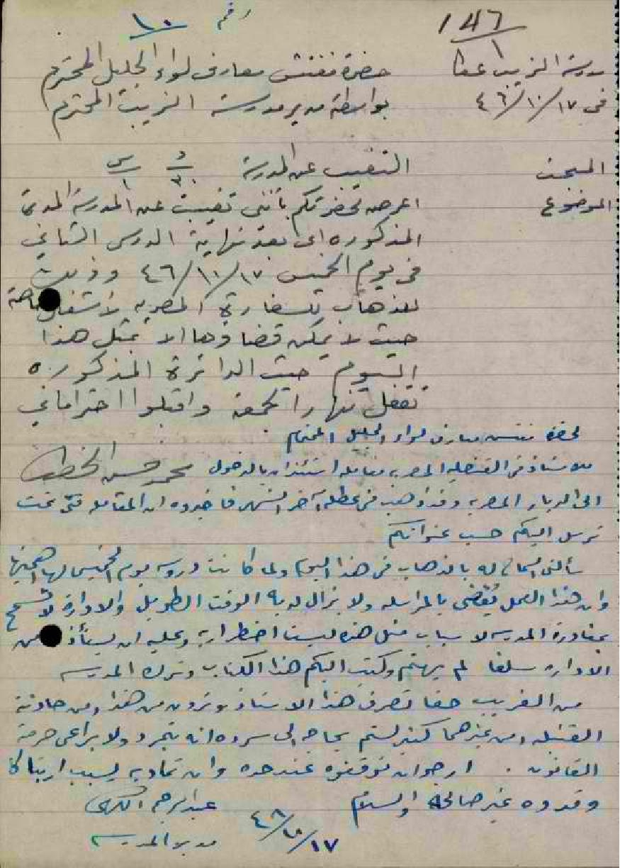 رسالة من مدير مدرسة الزيب الى مفتش المعارف مرفقة برسالة من المعلم محمد الخطيب بخصوص تغيبه عن المدرسة
