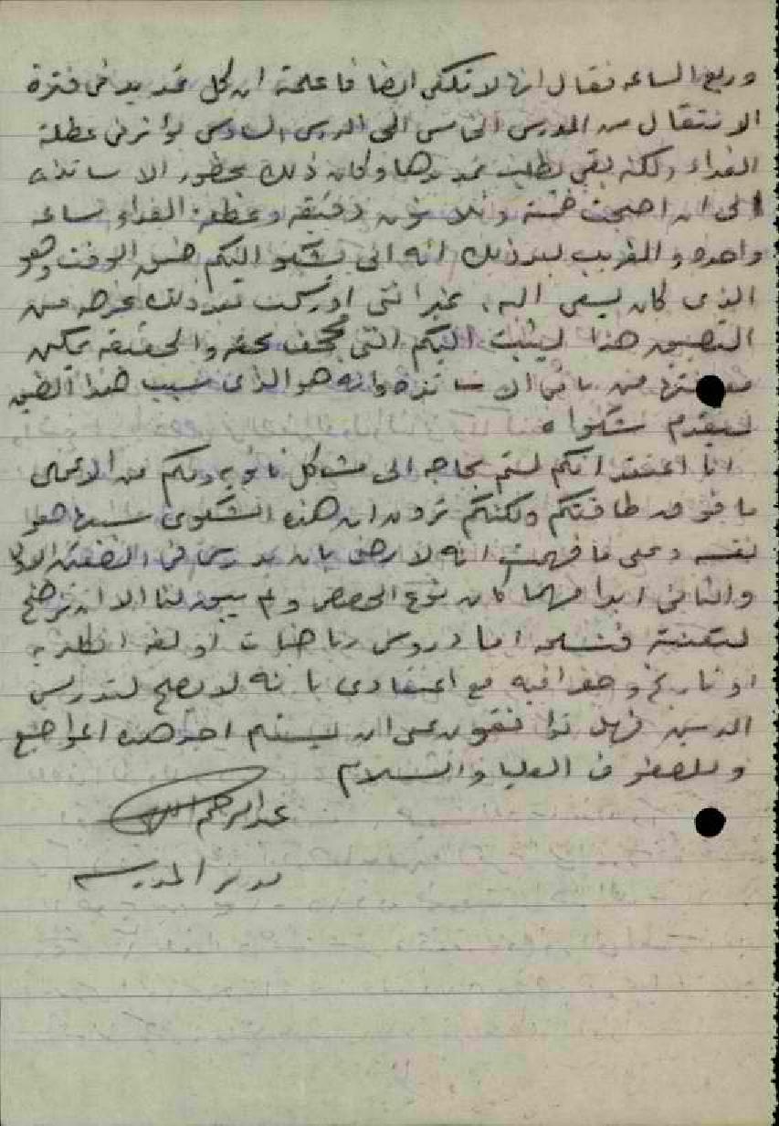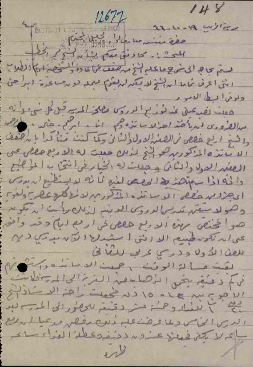 رسالة من مدير مدرسة الزيب الى مفتش المعارف بخصوص تغيب المعلم محمد الخطيب