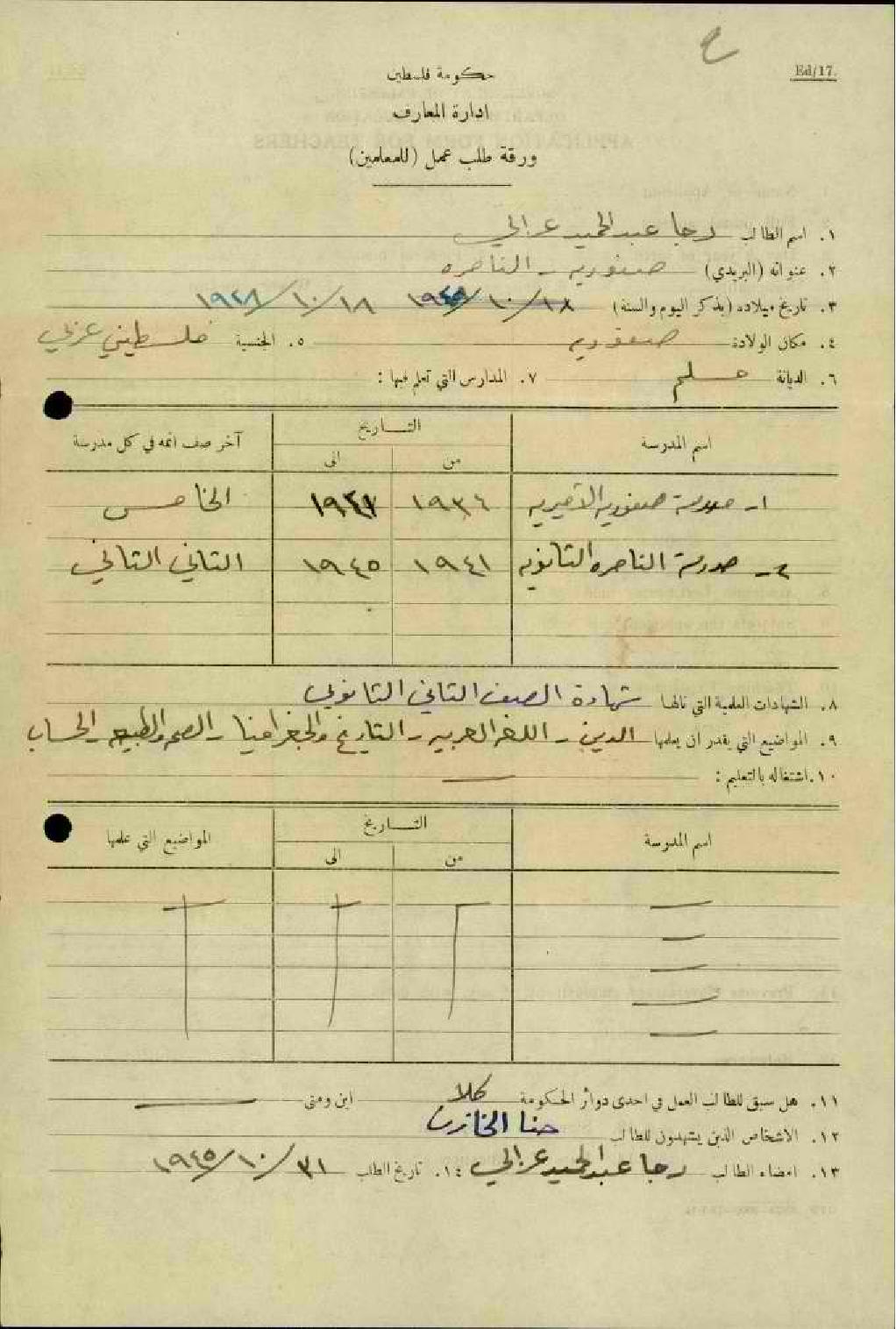 طلب توظيف مقدم من المعلم رجا عبد الحميد عرابي - مواليد 18/10/1928