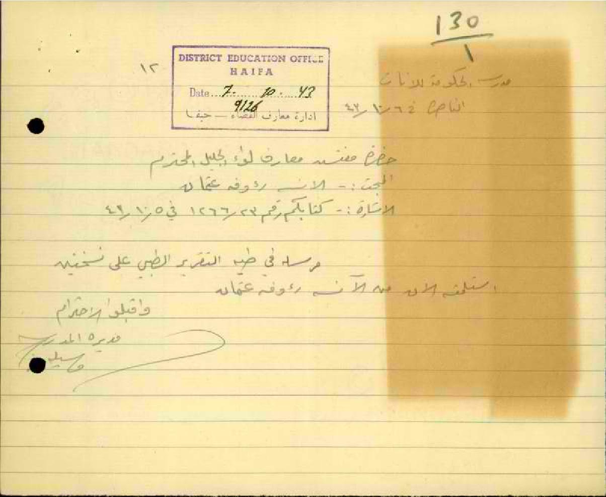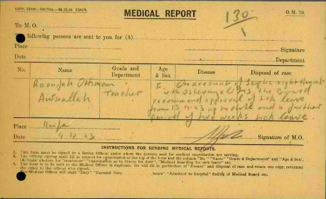 رسالة من مديرة مدرسة الناصرة الى مفتش المعارف مرفقة بالتقرير الطبي لتغيب المعلمة رؤوفة عون الله