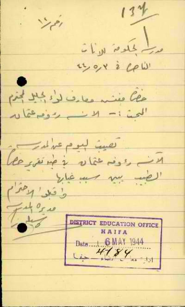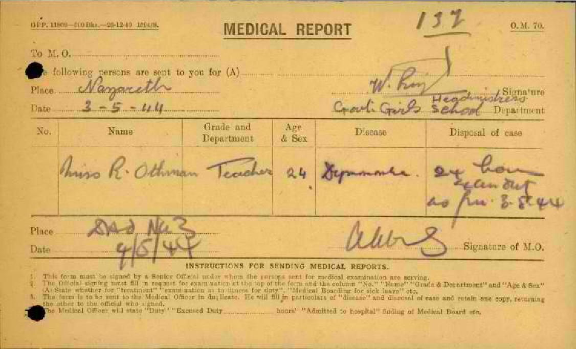 رسالة من مديرة مدرسة الناصرة الى مفتش المعارف بخصوص تغيب المعلمة رؤوفة عون الله مرفقة بالتقرير الطبي