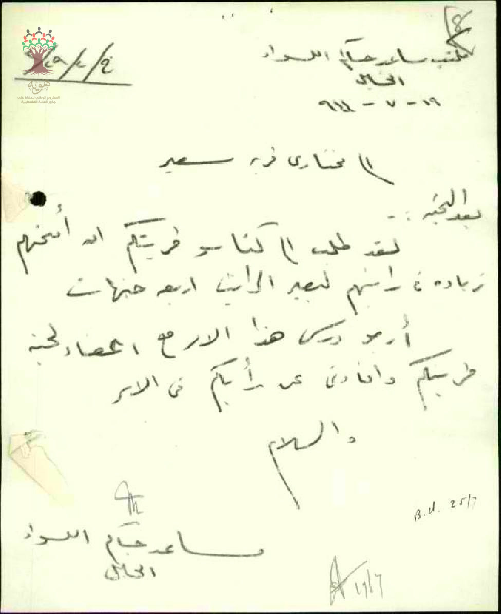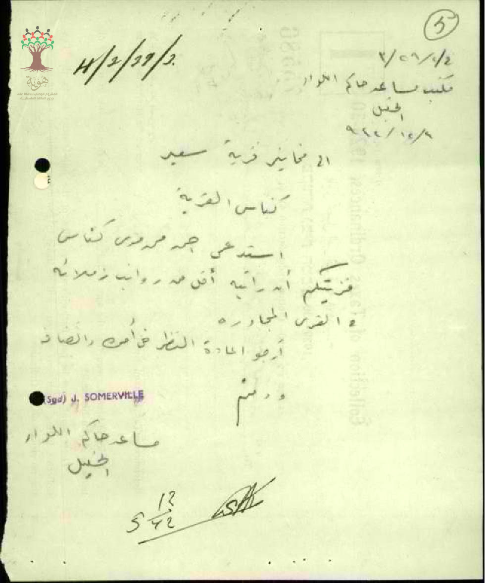 رسالة من مساعد حاكم لواء الخليل إلى مختاري قرية سعير بخصوص زيادة راتب كناس القرية