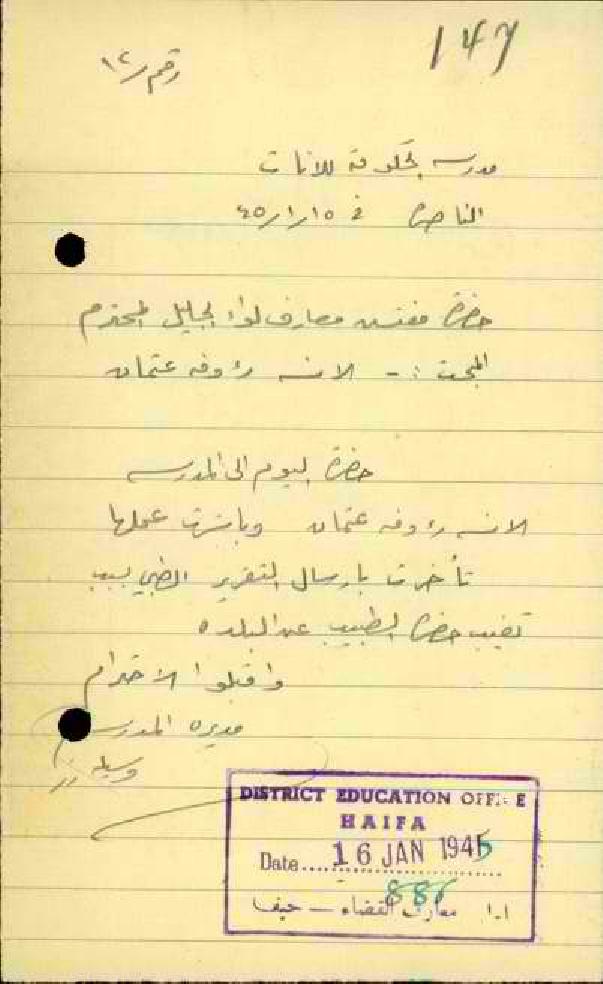 رسالة من مديرة مدرسة الناصرة الى مفتش المعارف بخصوص عودة المعلمة رؤوفة عون الله الى العمل