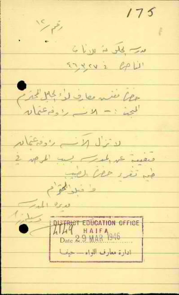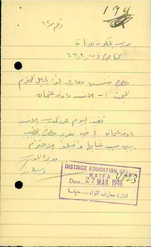 مجموعة رسائل من مديرة مدرسة الناصرة الى مفتش المعارف بخصوص تغيب المعلمة رؤوفة عون الله