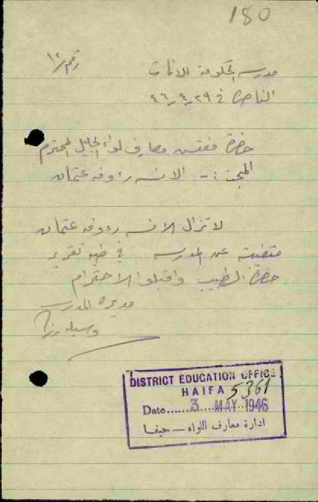 رسالة من مديرة مدرسة الناصرة الى مفتش المعارف تخبره بأن المعلمة رؤوفة عون الله لا تزال متغيبة عن العمل