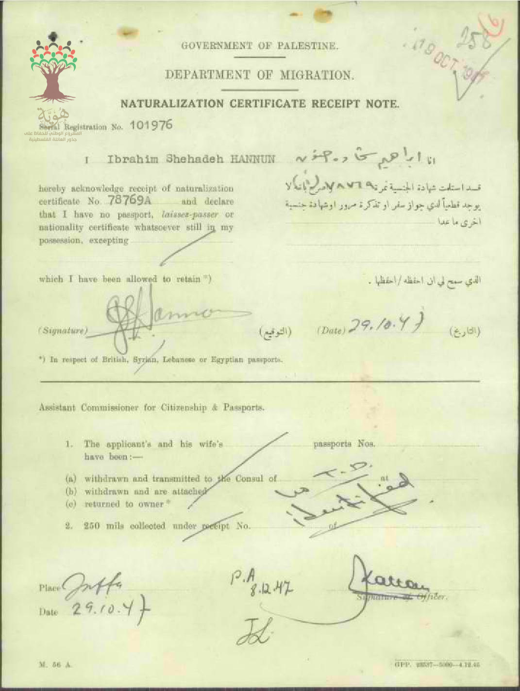 ايصال موقع من ابراهيم شحادة حنون باستلام شهادة الجنسية الفلسطينية