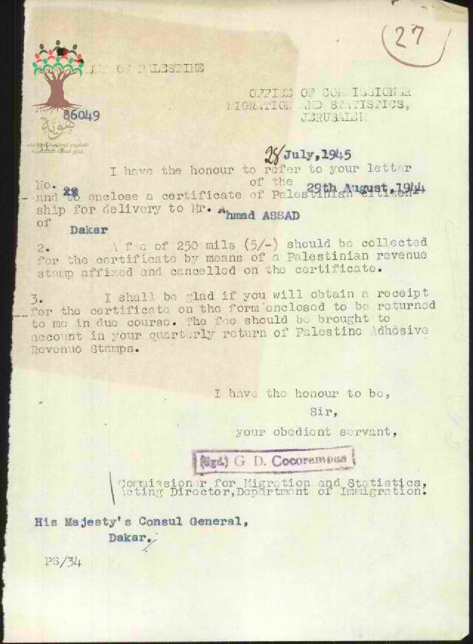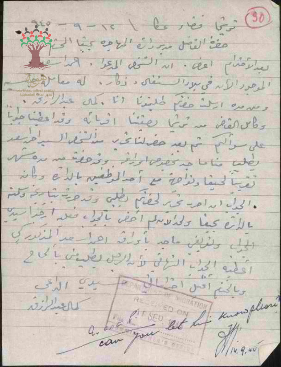 رسالة من كمال عبد الرازق إلى مدير دائرة المهاجرة بحيفا بخصوص أوراق طلب الجنسية الفلسطينية للسيد أحمد أسعد