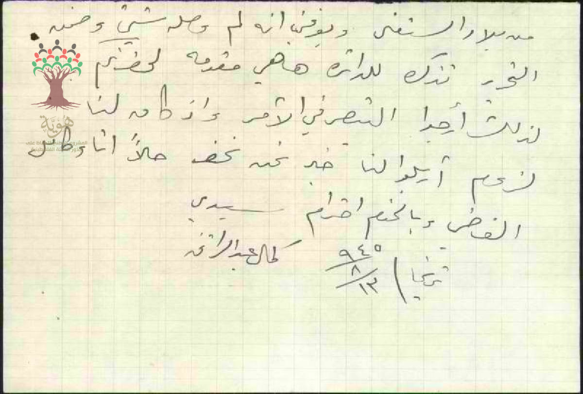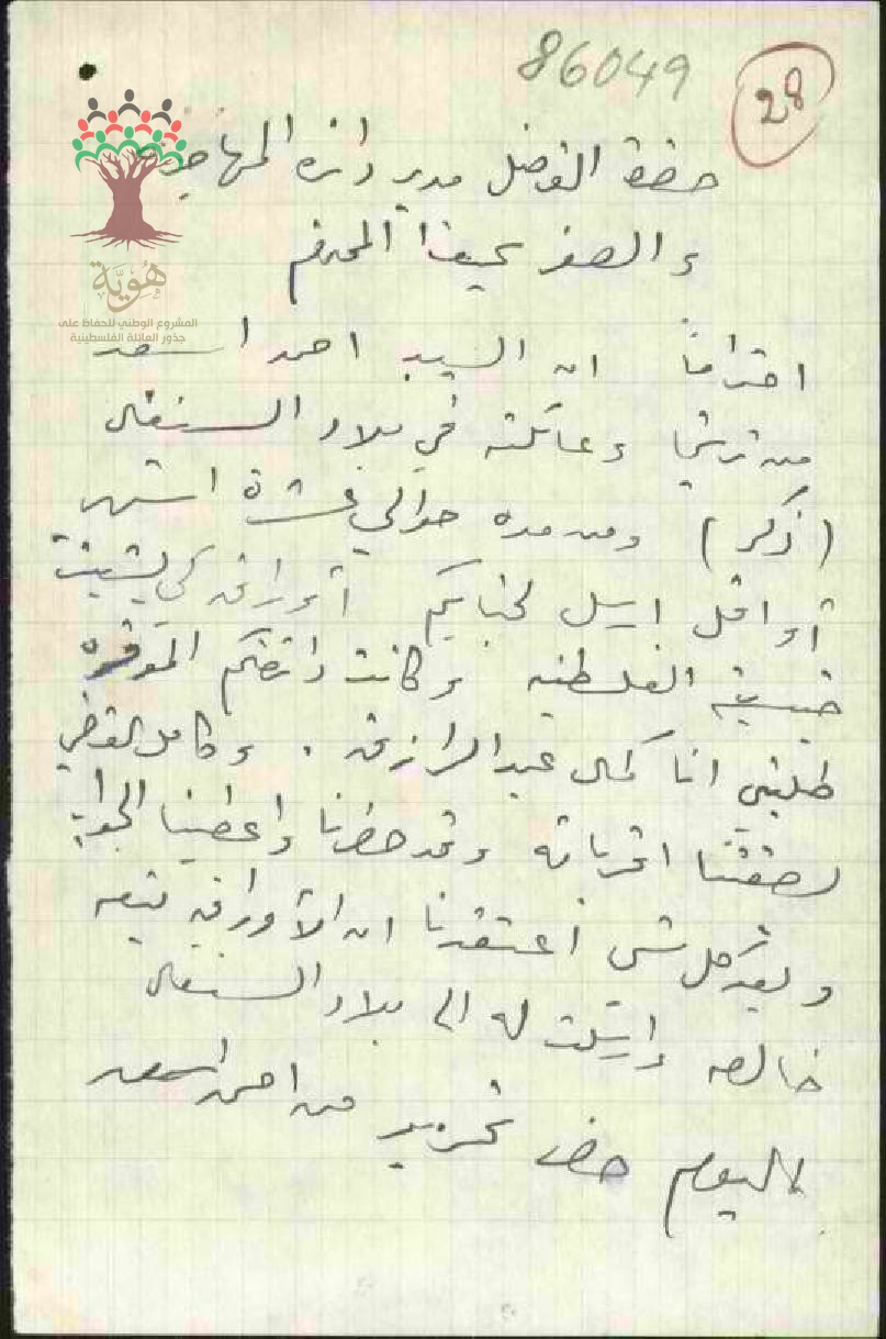 رسالة من كمال عبد الرازق إلى مدير دائرة المهاجرة بحيفا