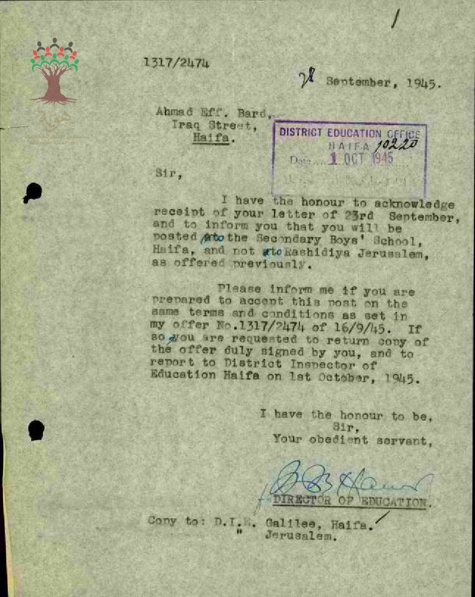 رسالة من مدير المعارف الى المعلم أحمد ابراهيم البرد يعرض عليه العمل كمدرس في مدرسة حيفا