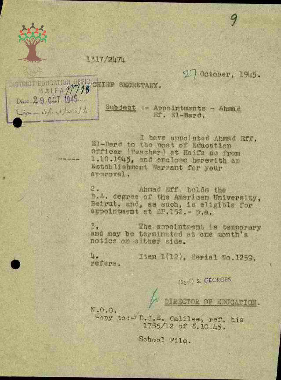 رسالة من مدير المعارف الى رئيس السكرتارية بخصوص تعيين المعلم أحمد البرد