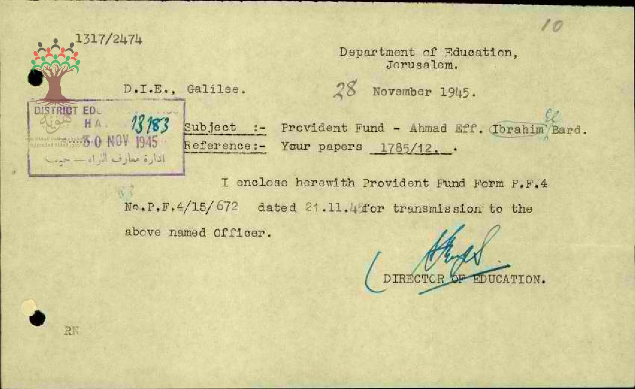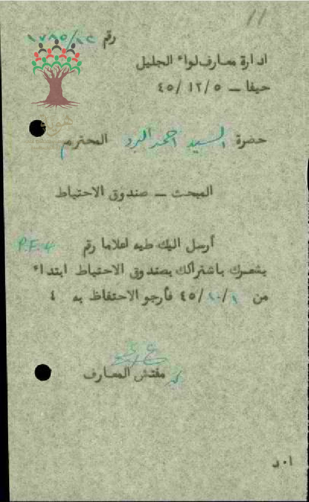 رسالة من مفتش المعارف الى المعلم أحمد البرد مرفقة بنسخة عن اشتراكه في صندوق الاحتياط