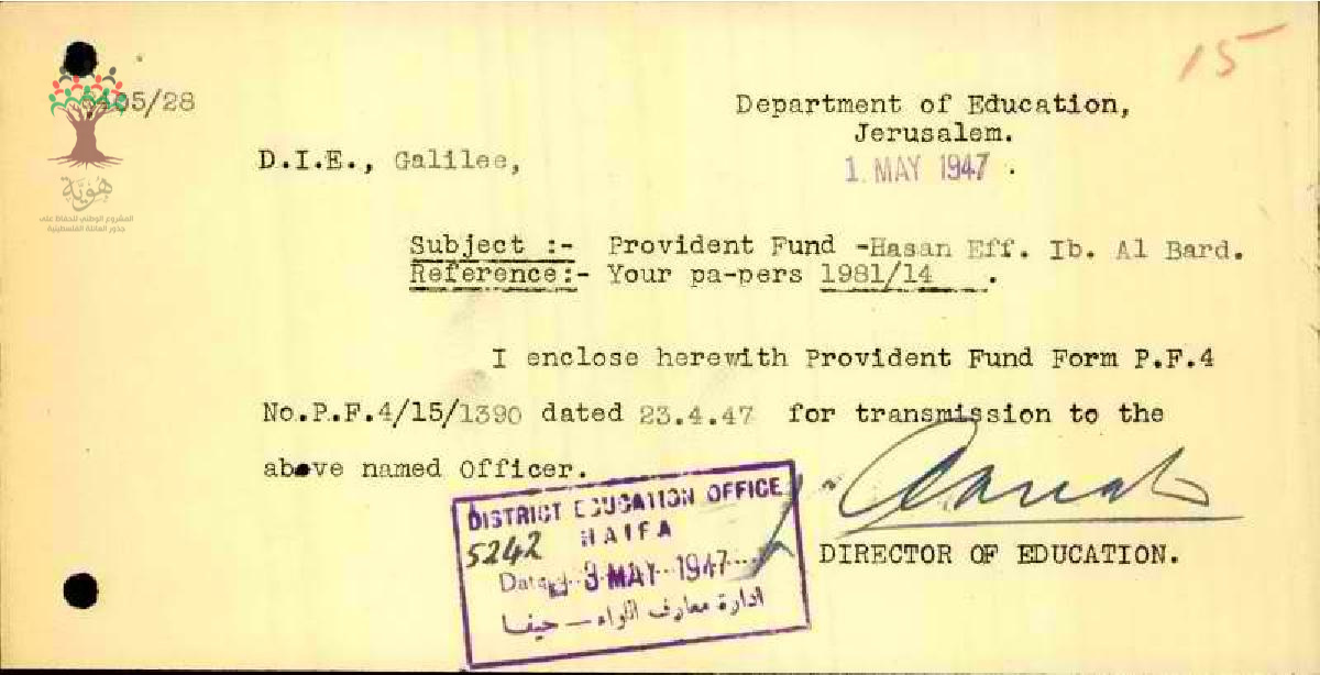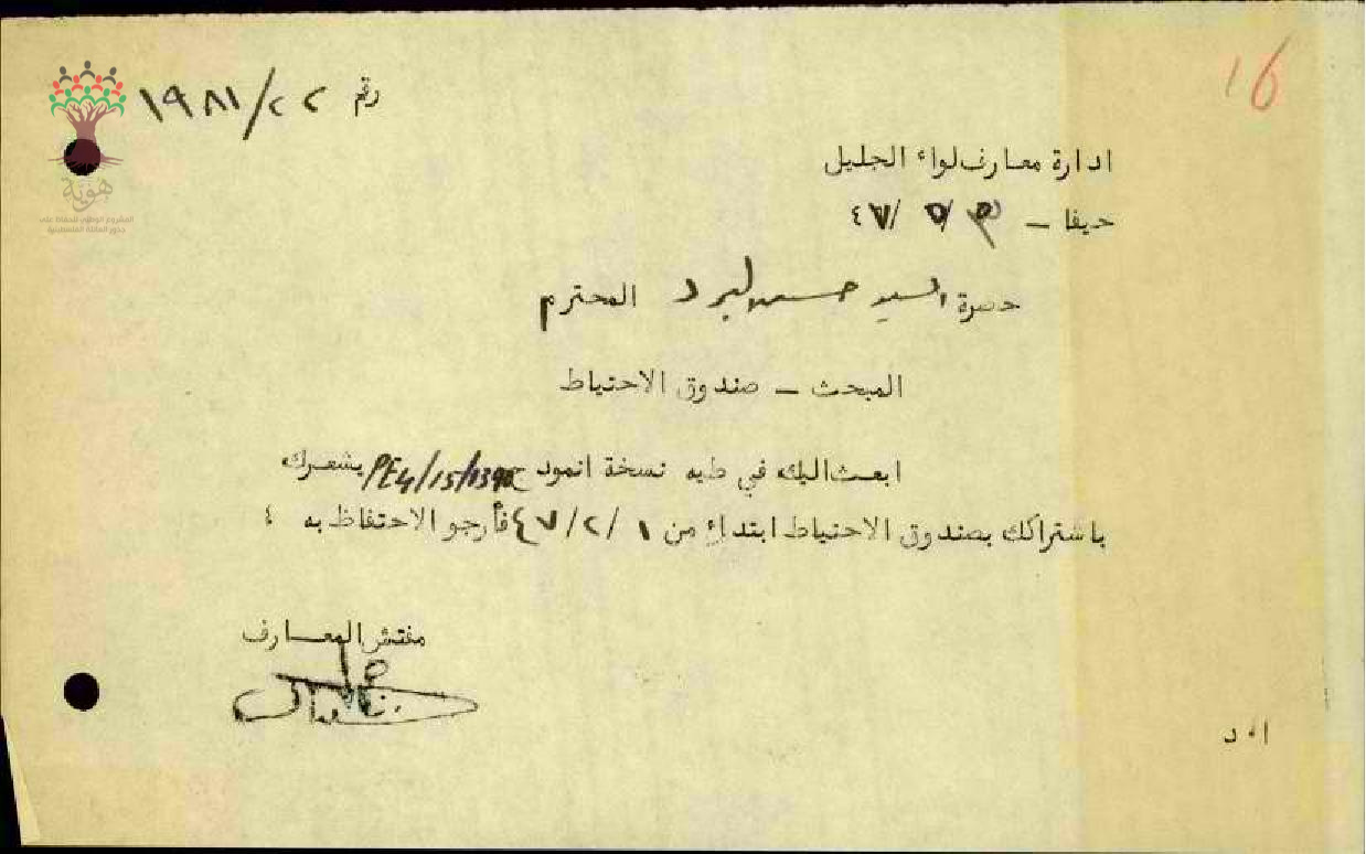 أوراق بخصوص اشتراك المعلم حسن ابراهيم البرد في صندوق الاحتياط
