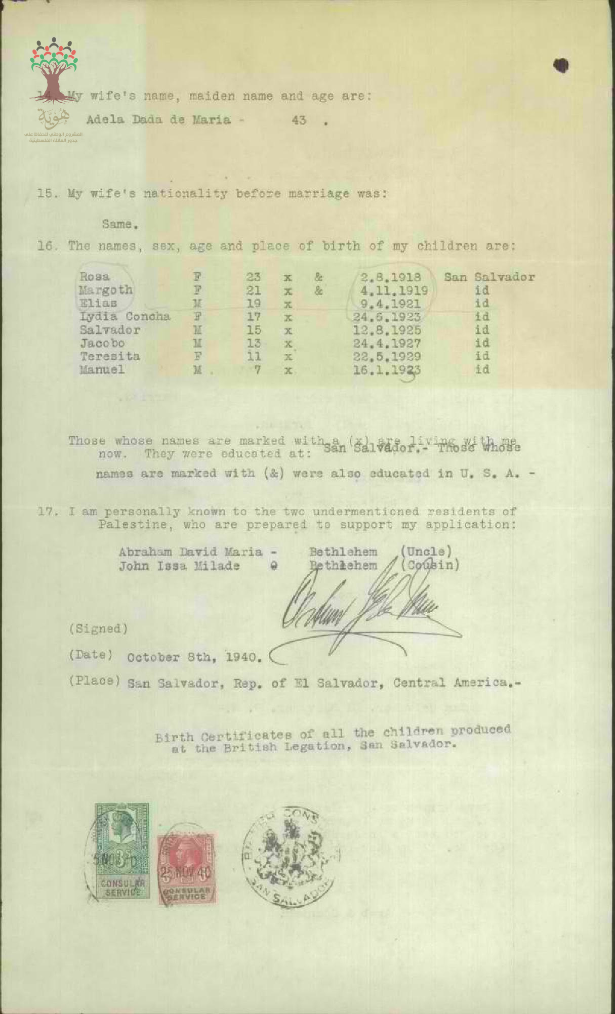 طلب الجنسية الفلسطينية - أرتورو جاد الله ماريا - بيت لحم / السلفادور