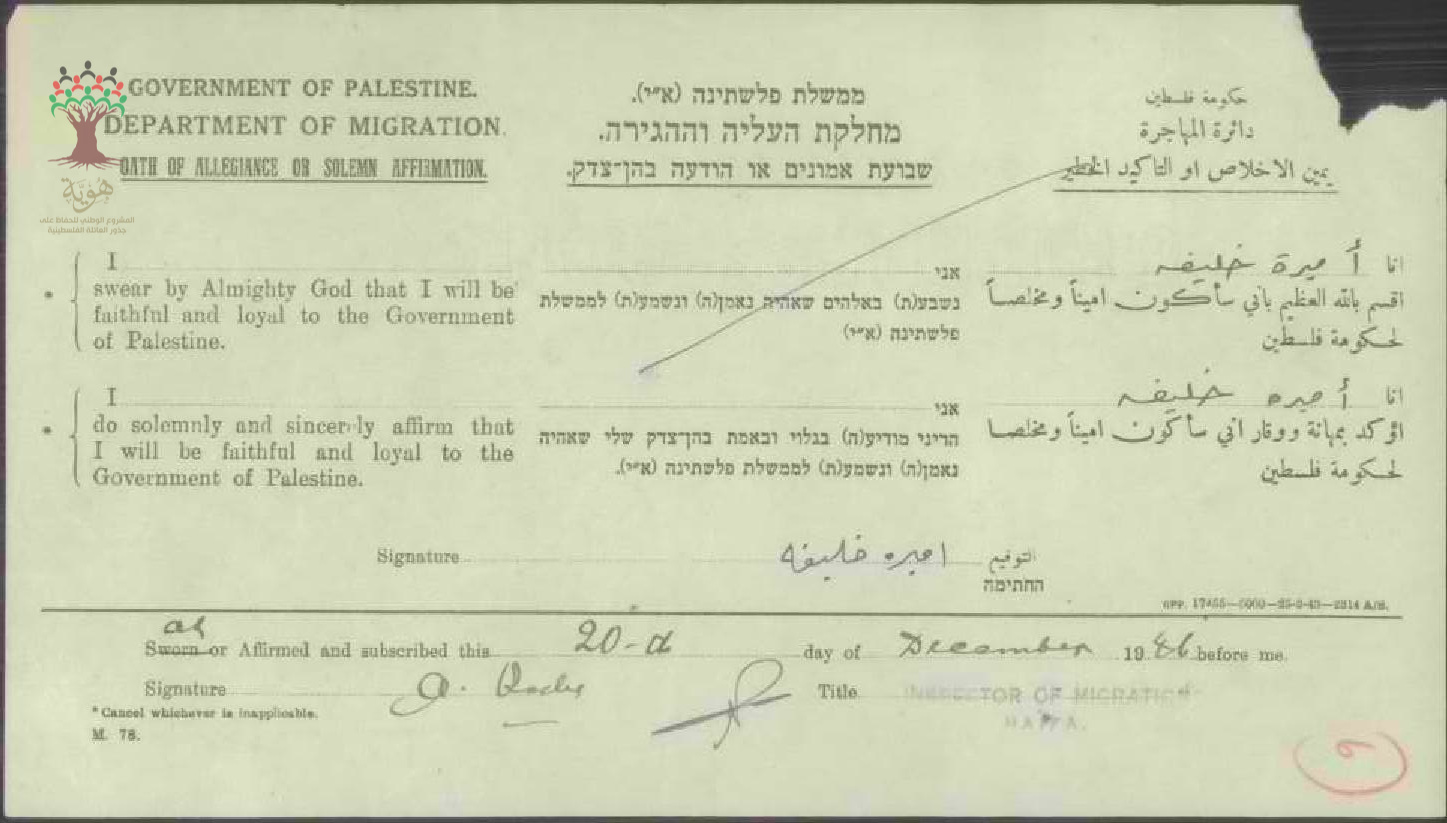 أميرة خليفة توقع على يمين الإخلاص للحصول على الجنسية الفلسطينية