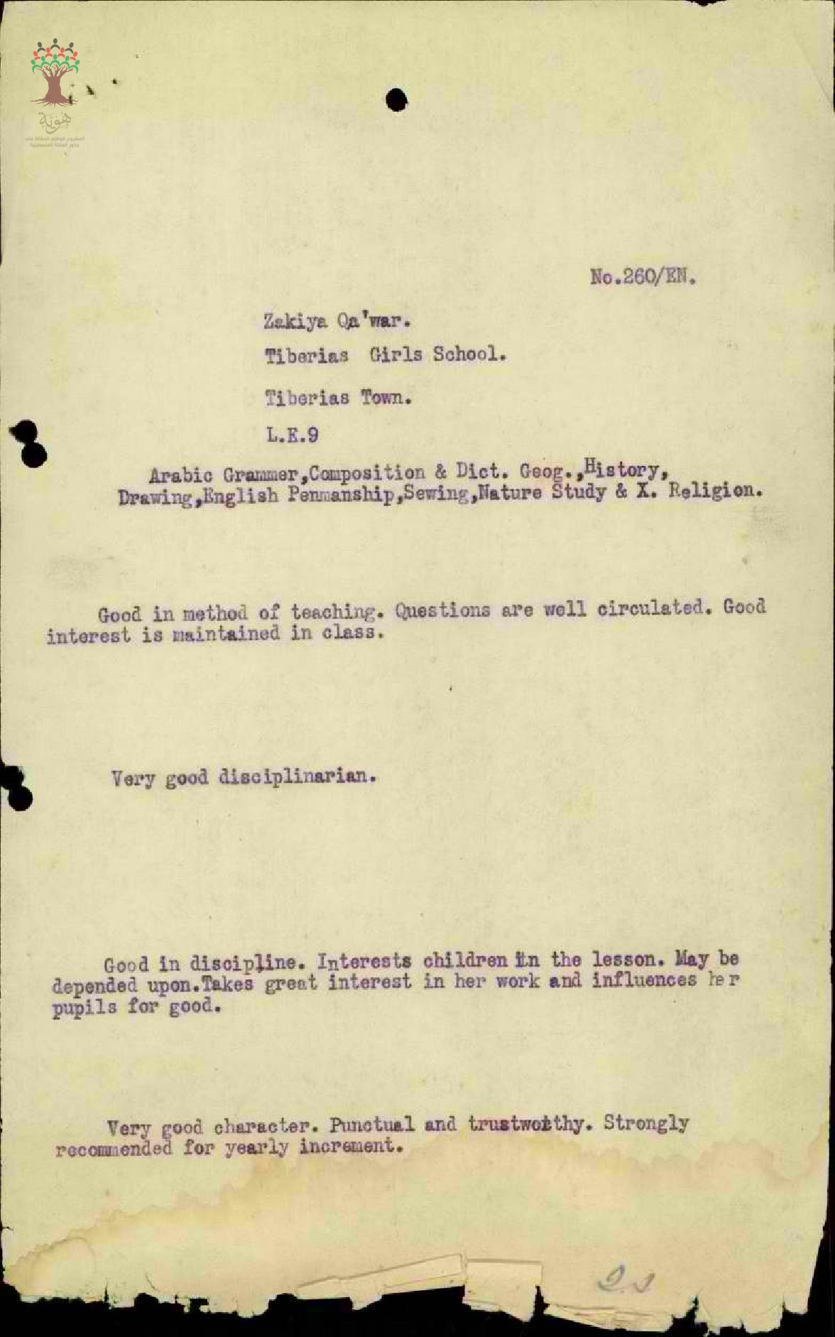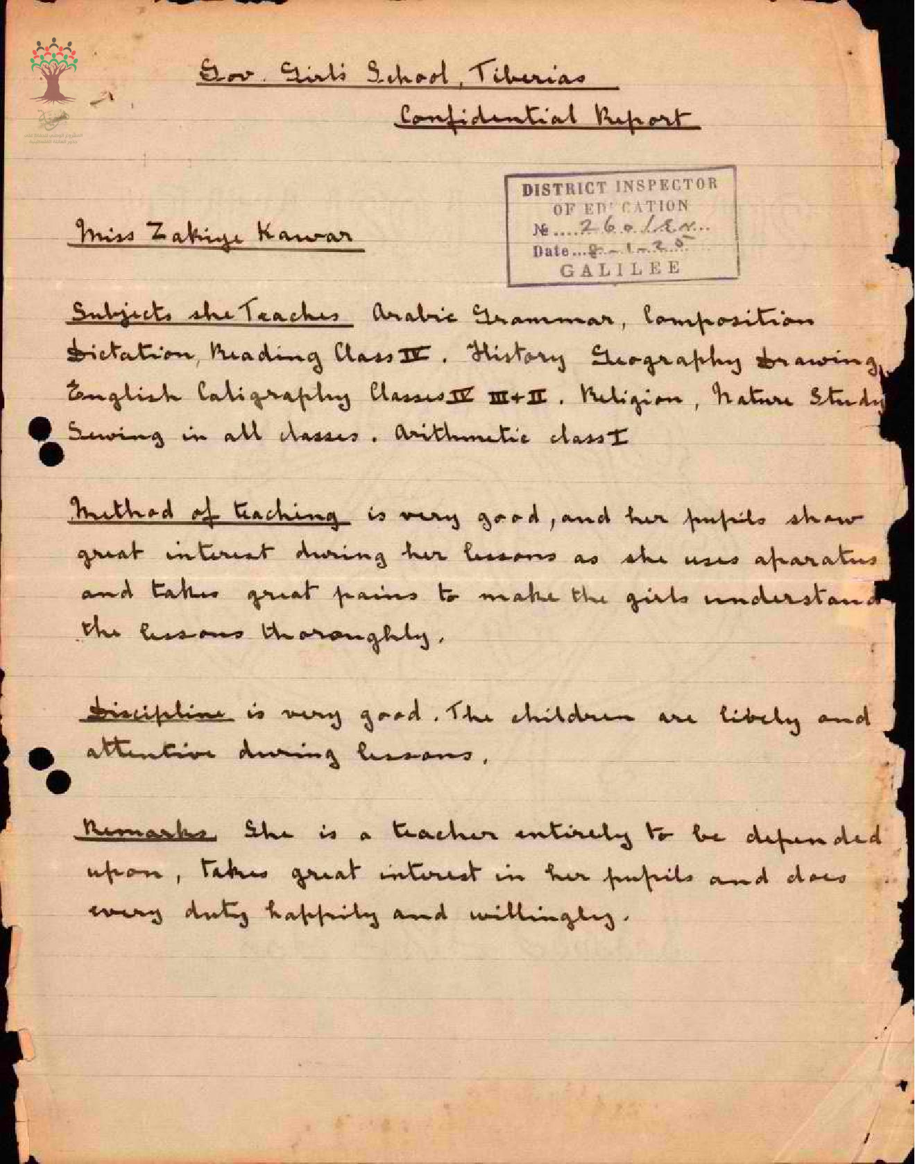 تقرير تفصيلي عن أداء المعلمة زكية بشارة قعوار في مدرسة اناث طبريا سنة 1925