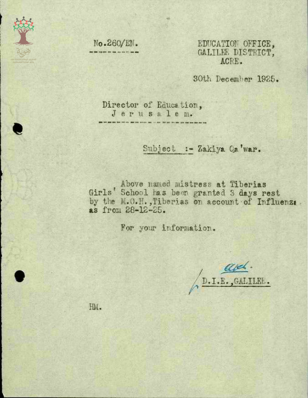 رسالة من مفتش المعارف الى مدير المعارف بخصوص اجازة مرضية للمعلمة زكية قعوار