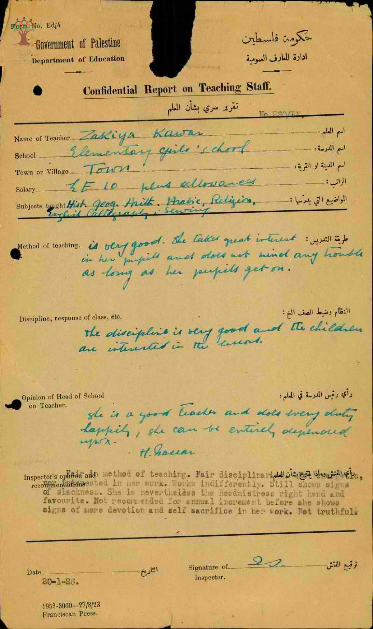 تقرير تفصيلي عن أداء المعلمة زكية بشارة قعوار في مدرسة اناث طبريا سنة 1925
