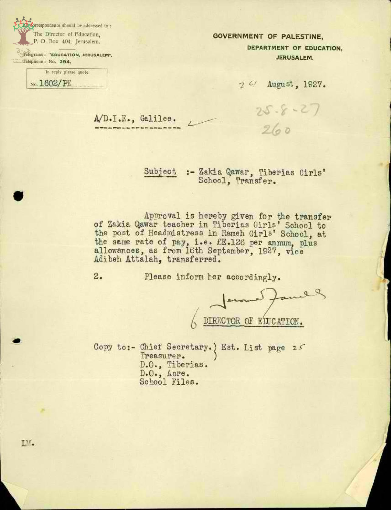 رسالة من مدير المعارف الى مفتش المعارف بخصوص الموافقة على نقل المعلمة زكية قعوار من مدرسة طبريا الى مدرسة الرامة