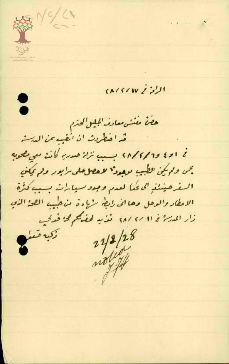 رسالة من المعلمة زكية قعوار الى مفتش المعارف بخصوص تغيبها عن العمل بسبب المرض