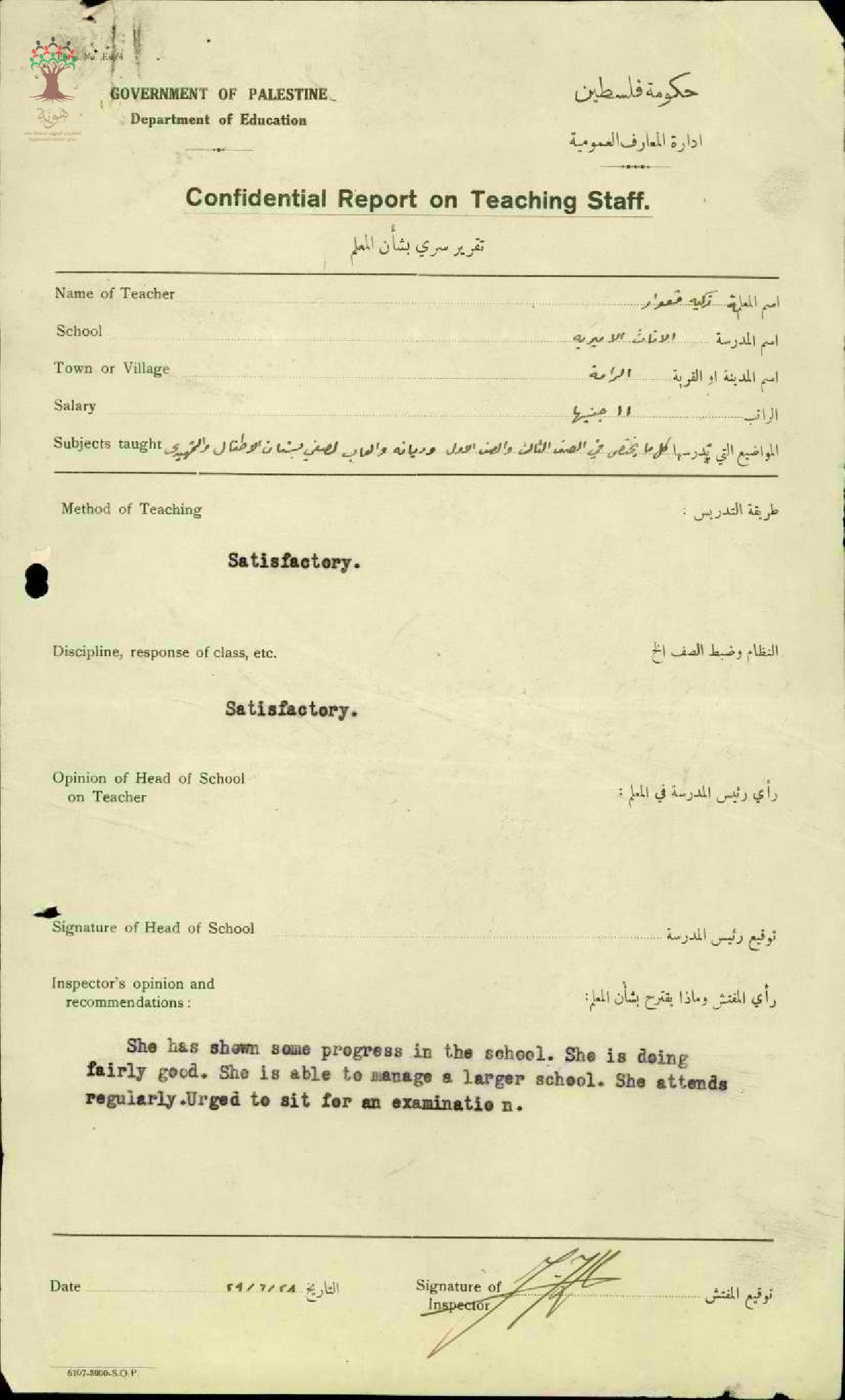 تقرير تفصيلي عن أداء المعلمة زكية بشارة قعوار في مدرسة اناث الرامة سنة 1929
