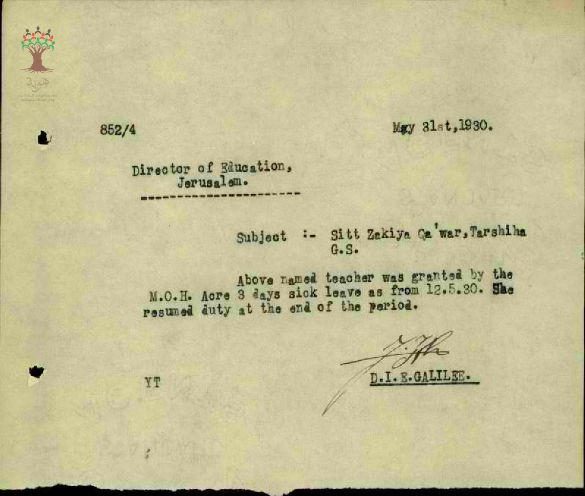رسالة من مفتش المعارف الى مدير المعارف بخصوص تغيب المعلمة زكية قعوار وعودتها الى العمل