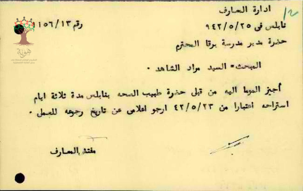 رسالة من مفتش المعارف الى مدير مدرسة برقا يسأل عن موعد عودة المعلم مراد الشاهد الى العمل