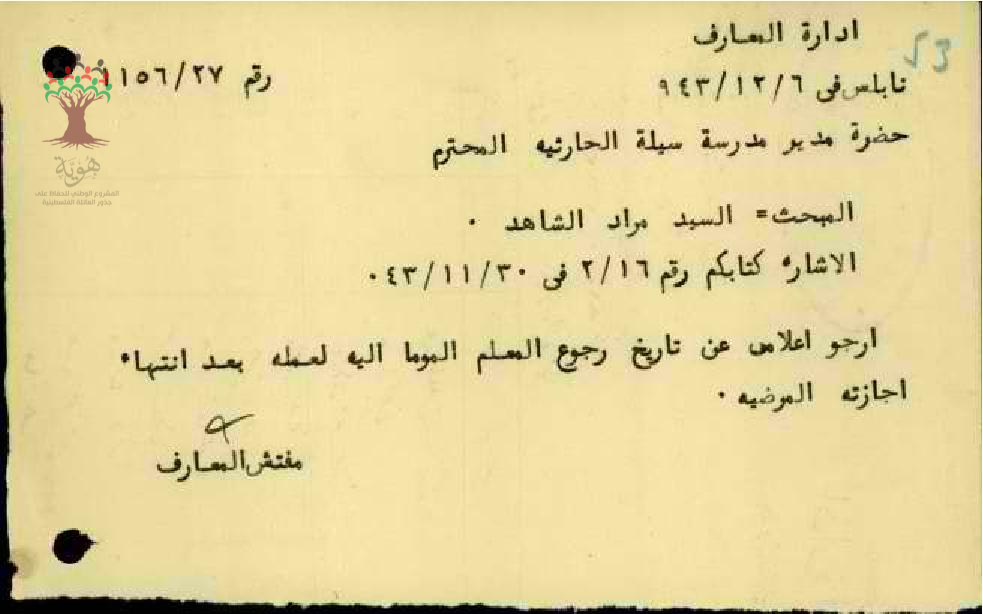 رسالة من مفتش المعارف الى مدير مدرسة سيلة الحارثية يسأل عن موعد عودة المعلم مراد الشاهد الى العمل