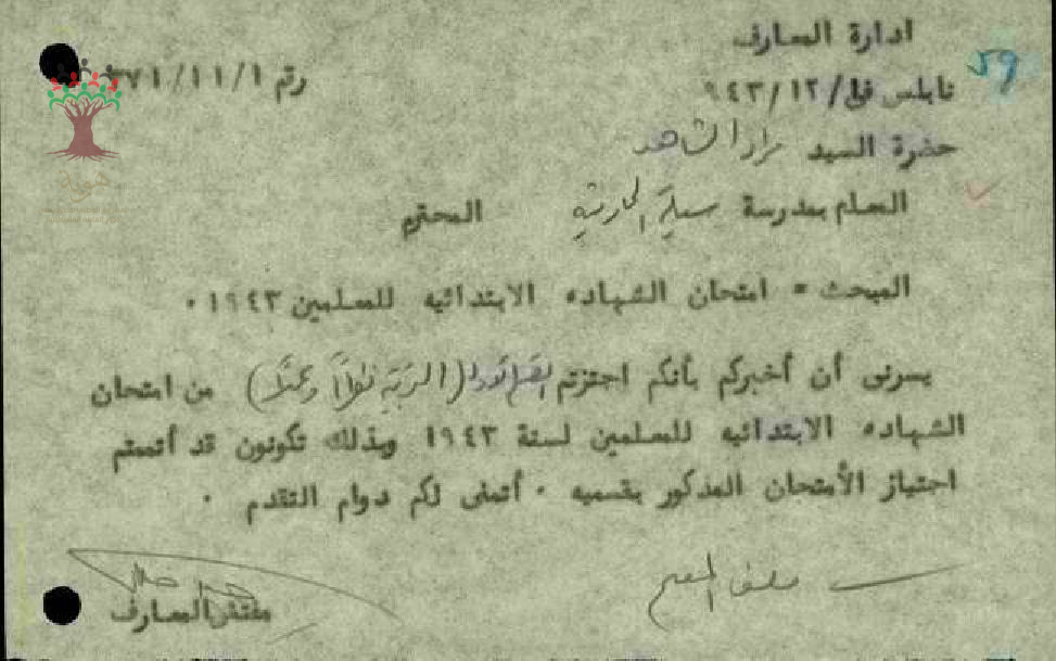 رسالة من مفتش المعارف الى المعلم مراد الشاهد يخبره بأنه قد اجتاز القسم الاول من امتحان الشهادة الابتدائية