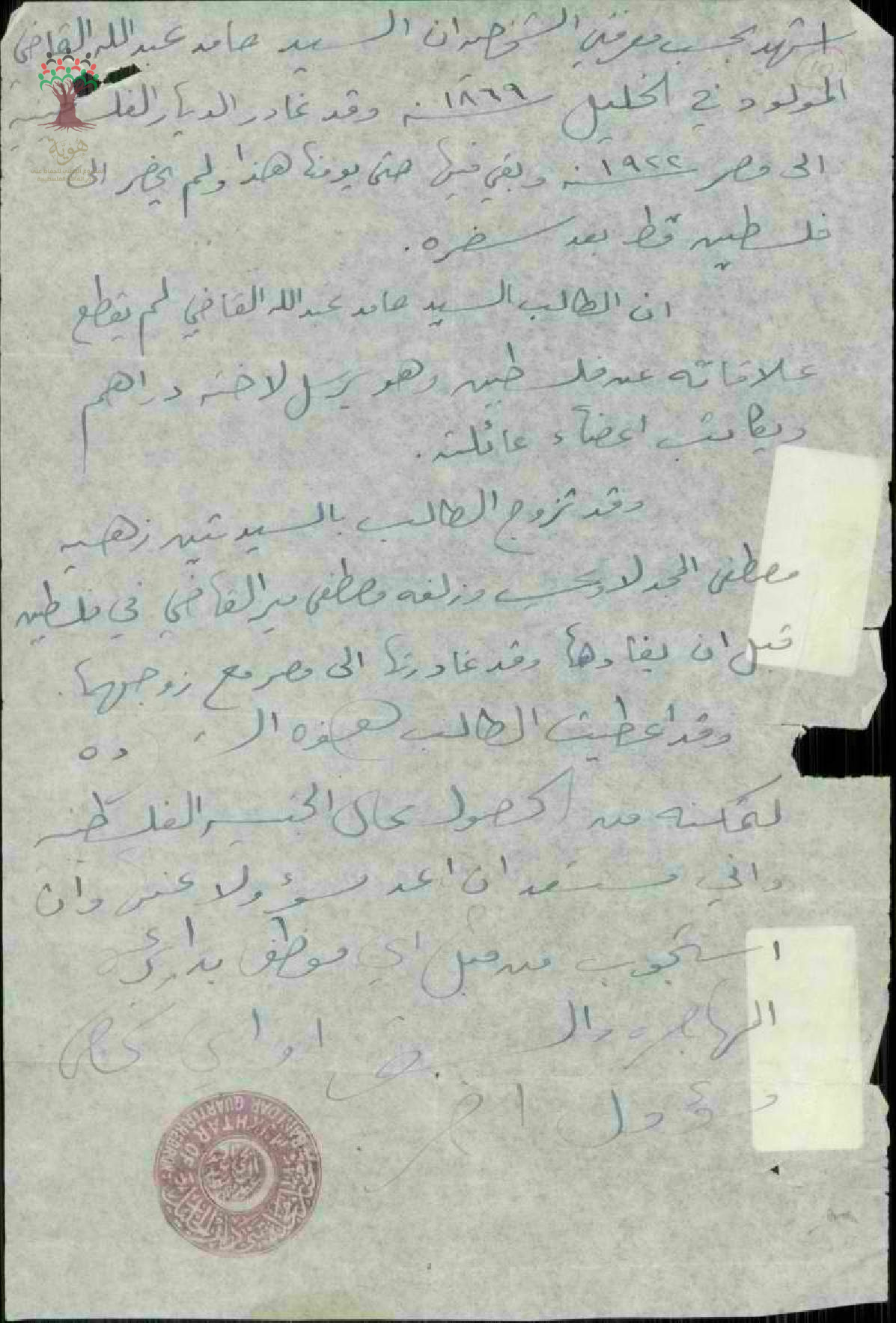 شهادة المختار للسيد حامد القاضي بخصوص طلب الجنسية - الخليل