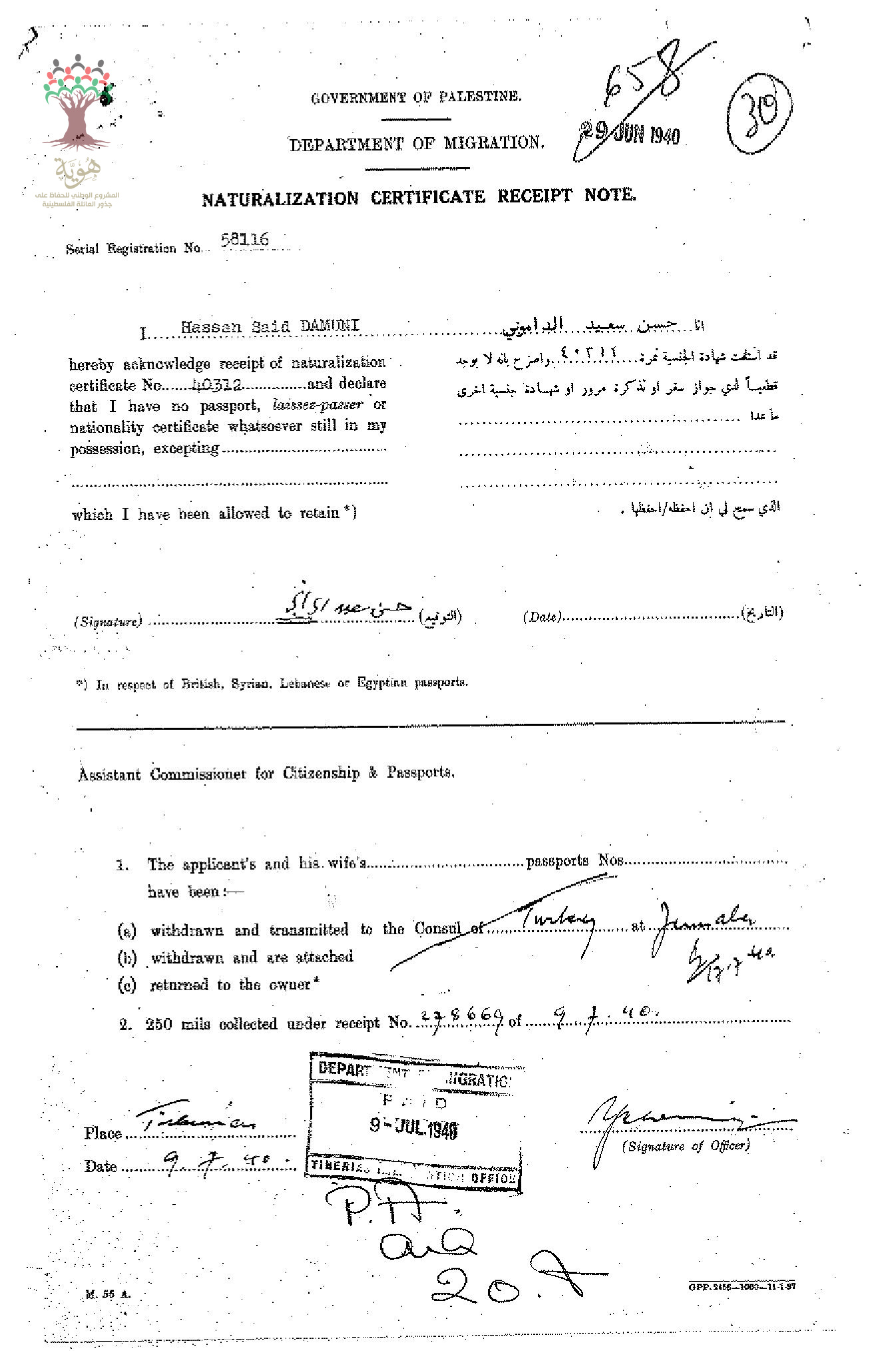 ايصال موقع من حسن سعيد الداموني باستلام شهادة الجنسية الفلسطينية