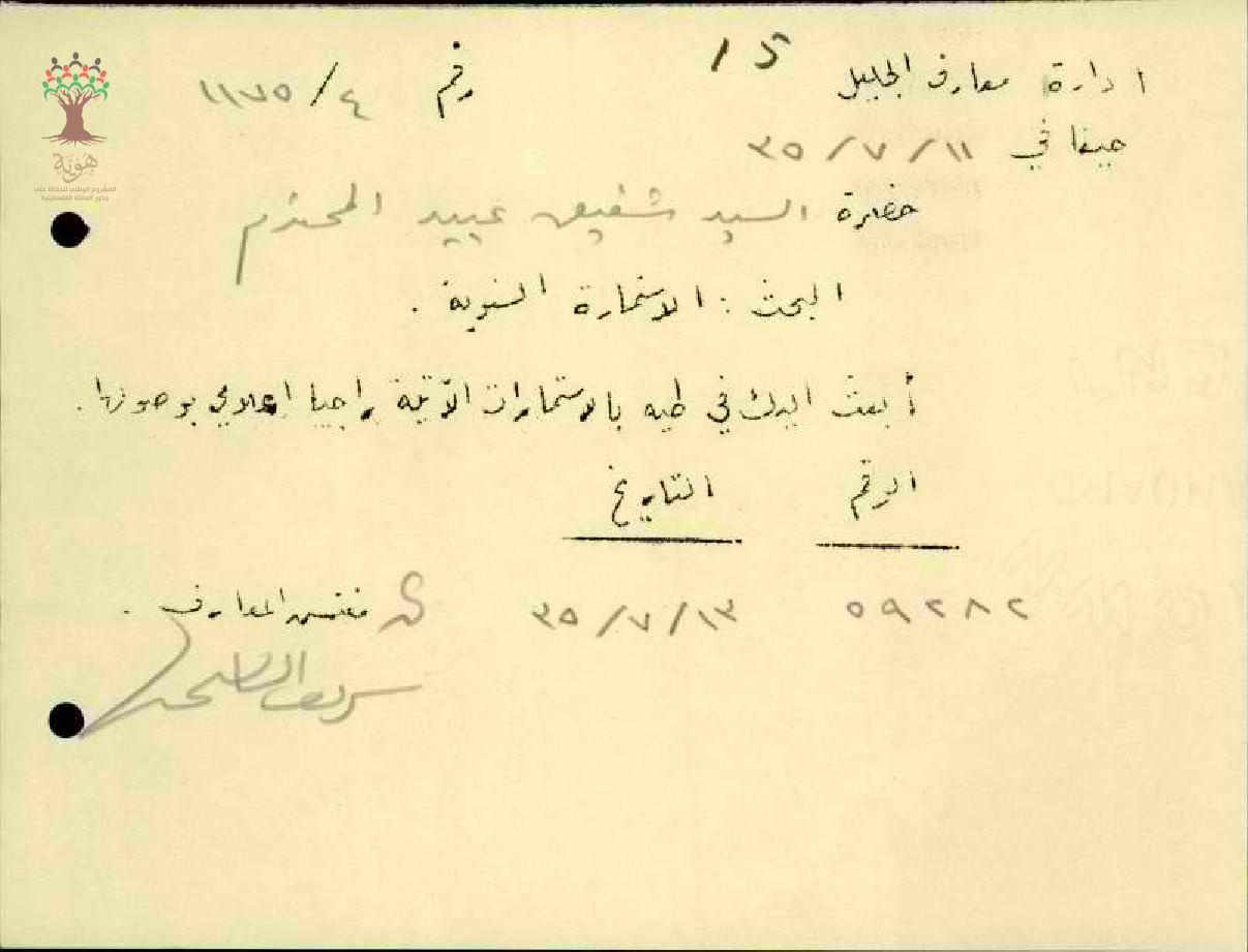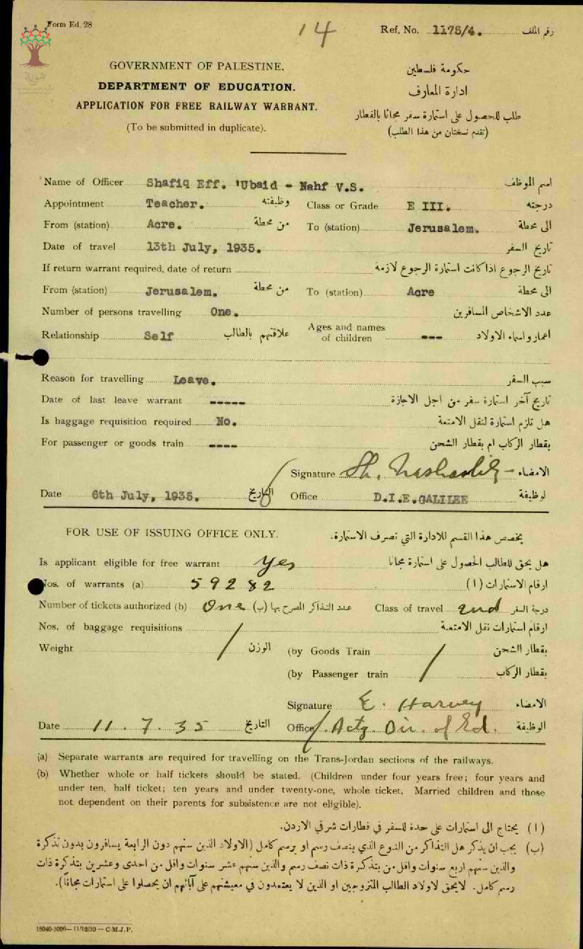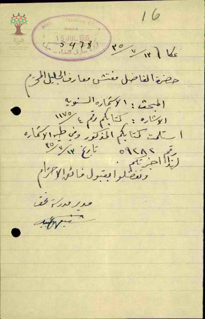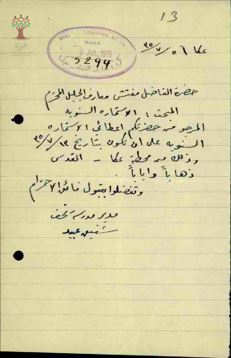 طلب استمارة سنوية مقدم من قبل المعلم شفيق سليم عبيد - عكا - مدرسة نحف