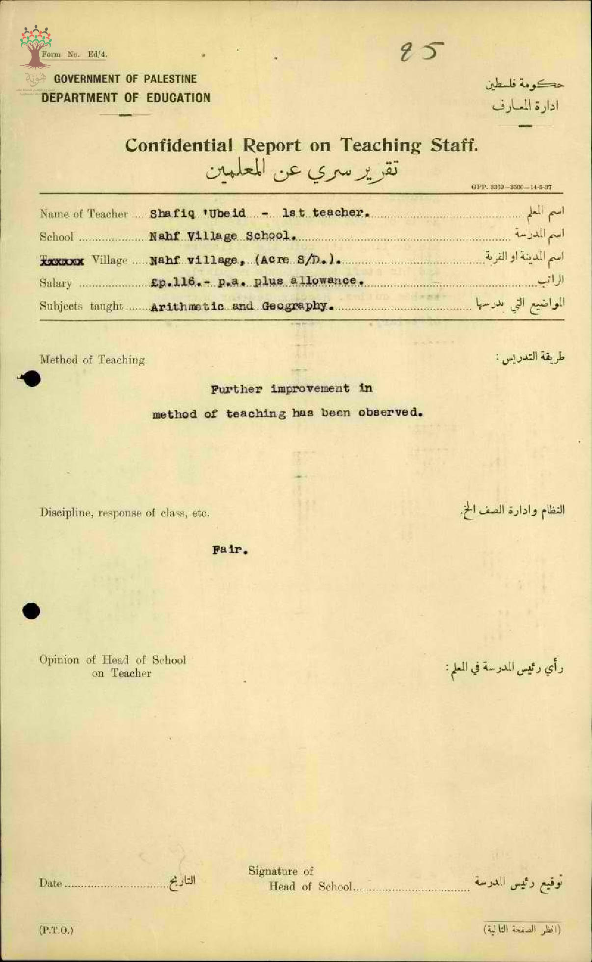 رأي مدير مدرسة نحف بالمعلم شفيق سليم عبيد - عكا - مدرسة نحف