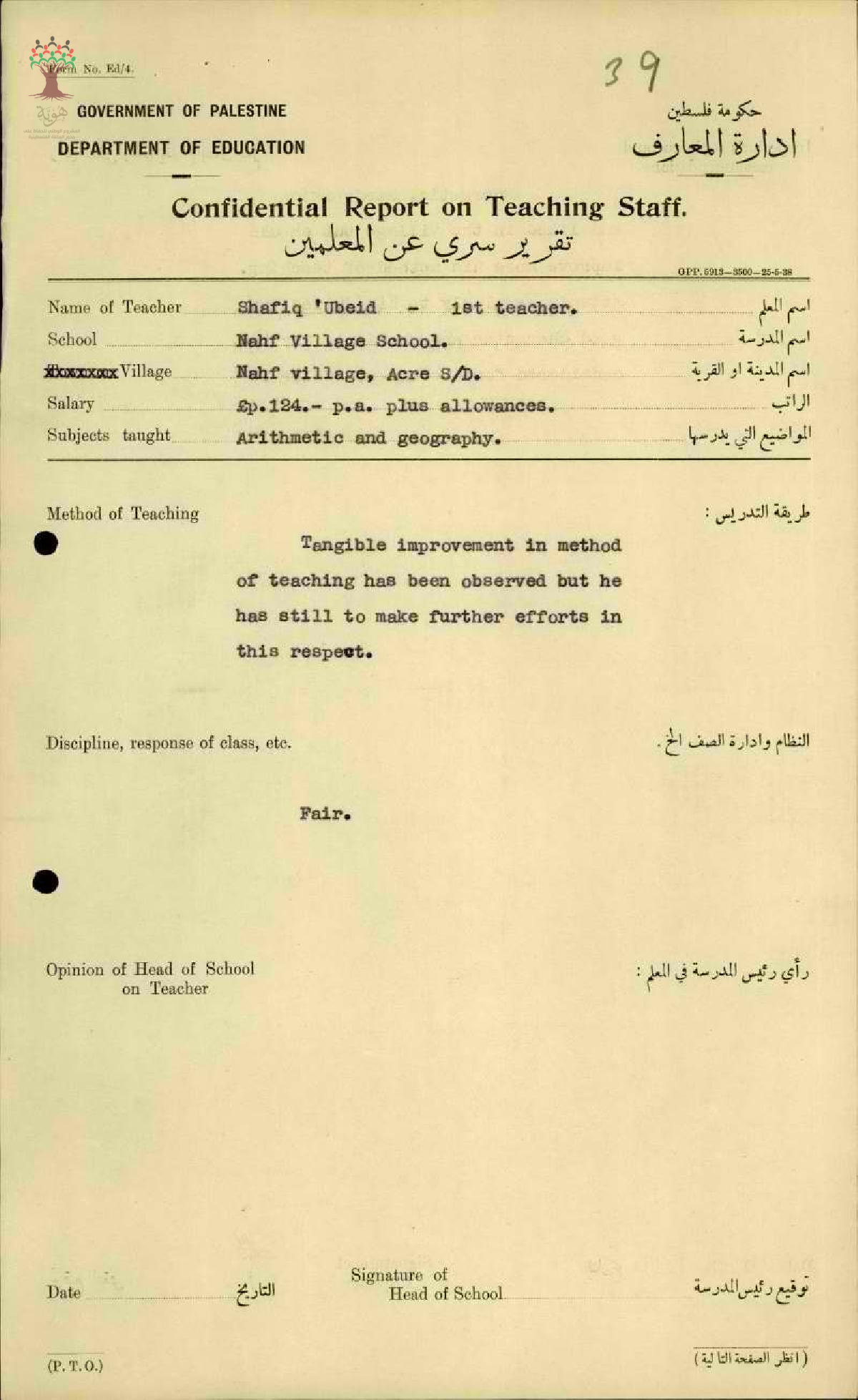 رأي مدير مدرسة نحف بالمعلم شفيق سليم عبيد - عكا - مدرسة نحف