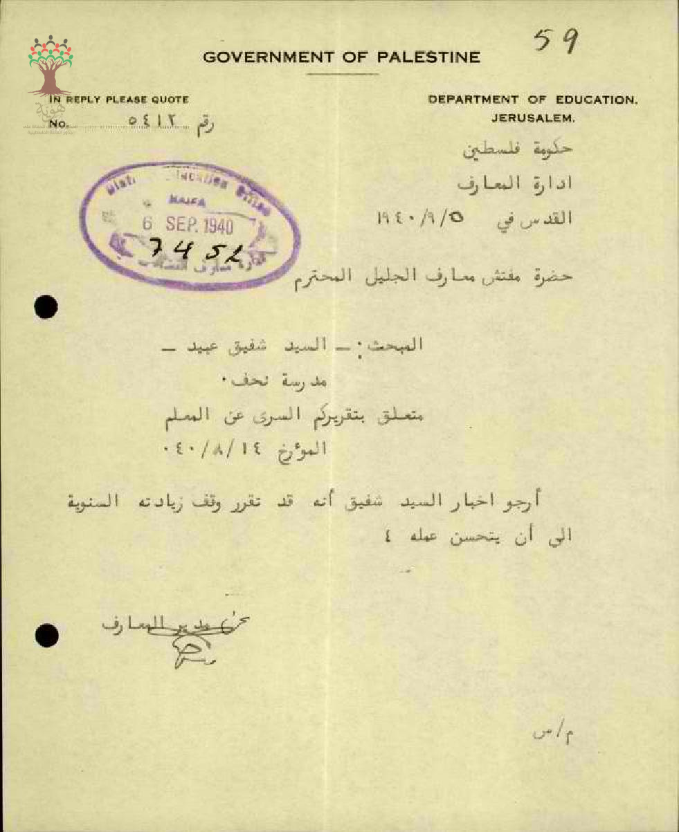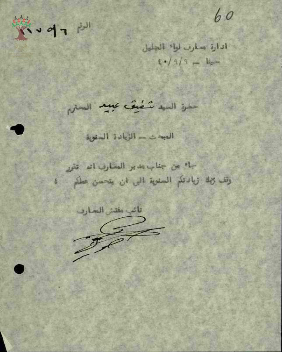 ايقاف زيادة المرتب السنوية للمعلم شفيق سليم عبيد - عكا - مدرسة نحف