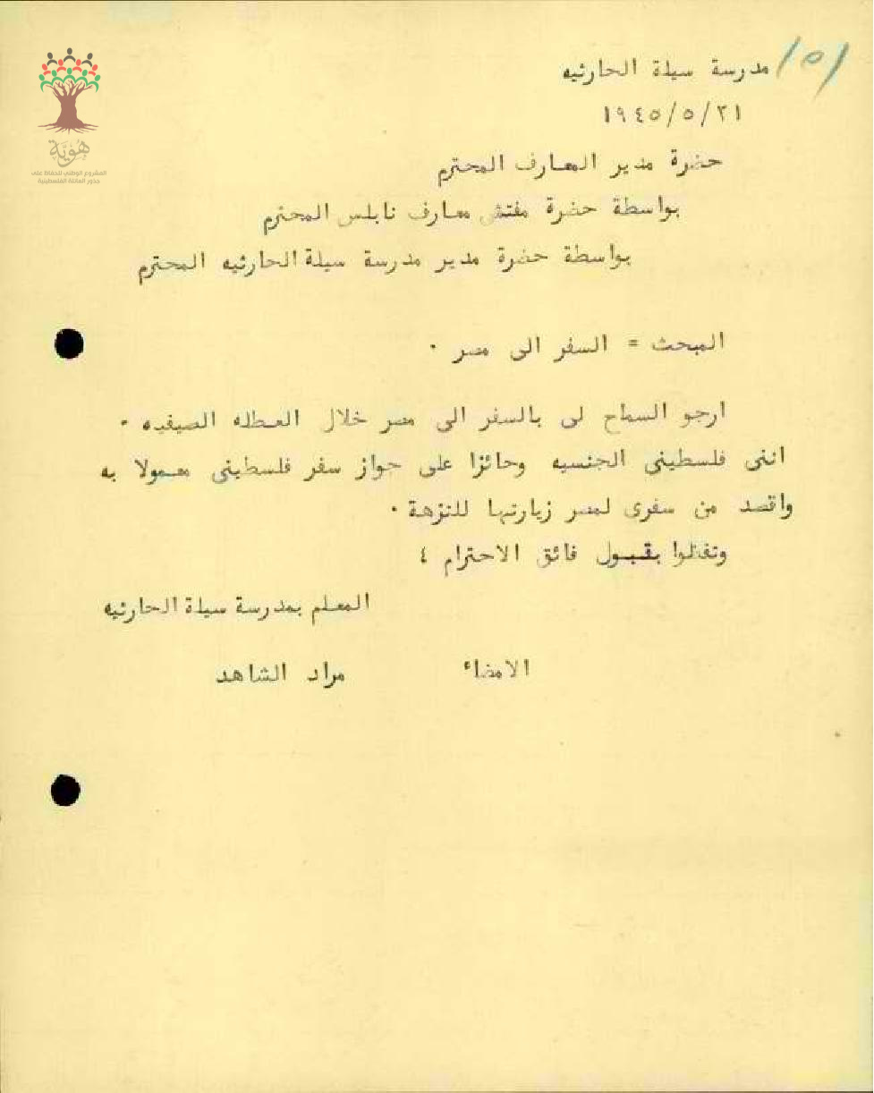 رسالة من المعلم مراد الشاهد الى مفتش المعارف يطلب الاذن بالسفر الى مصر خلال العطلة الصيفية