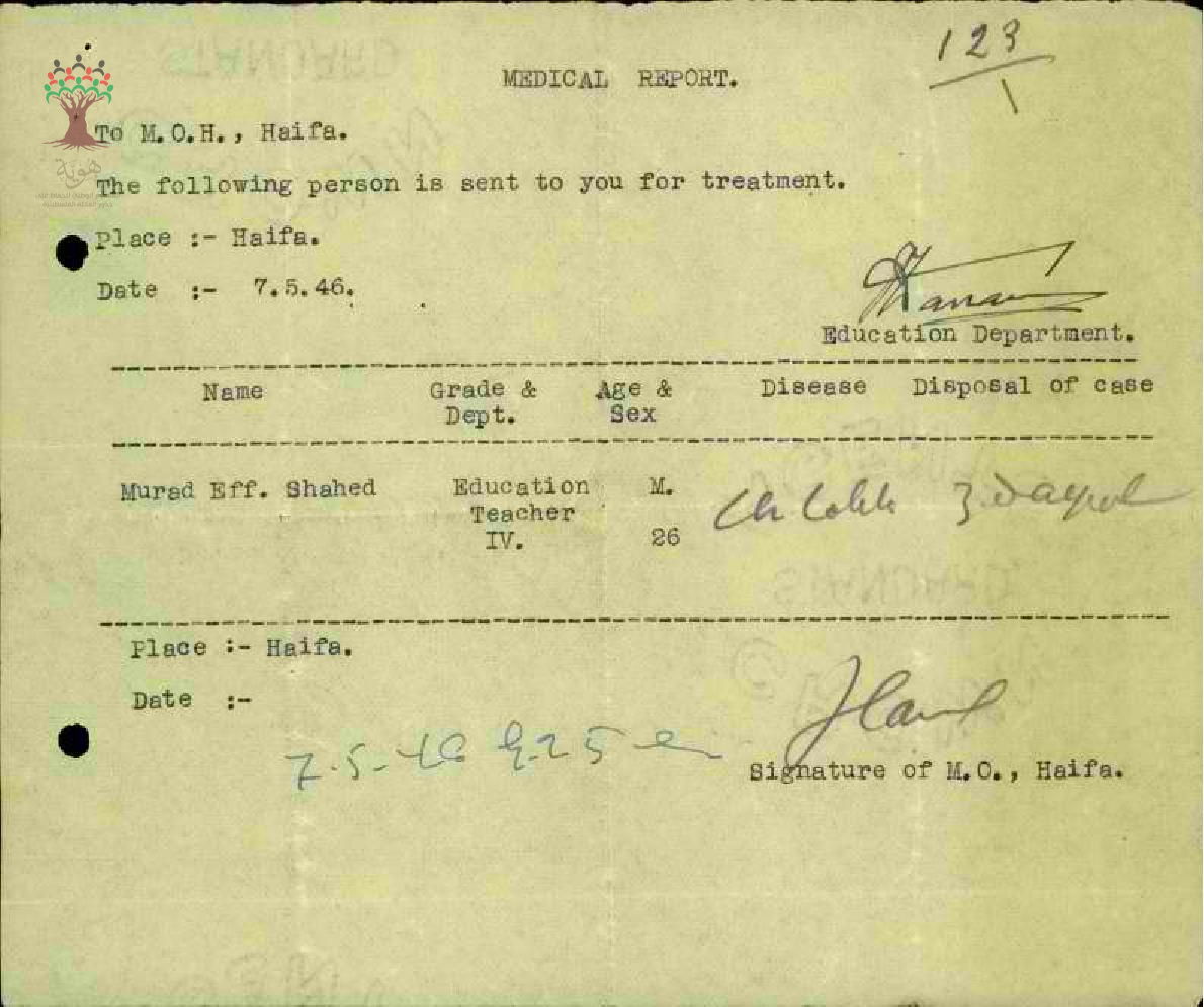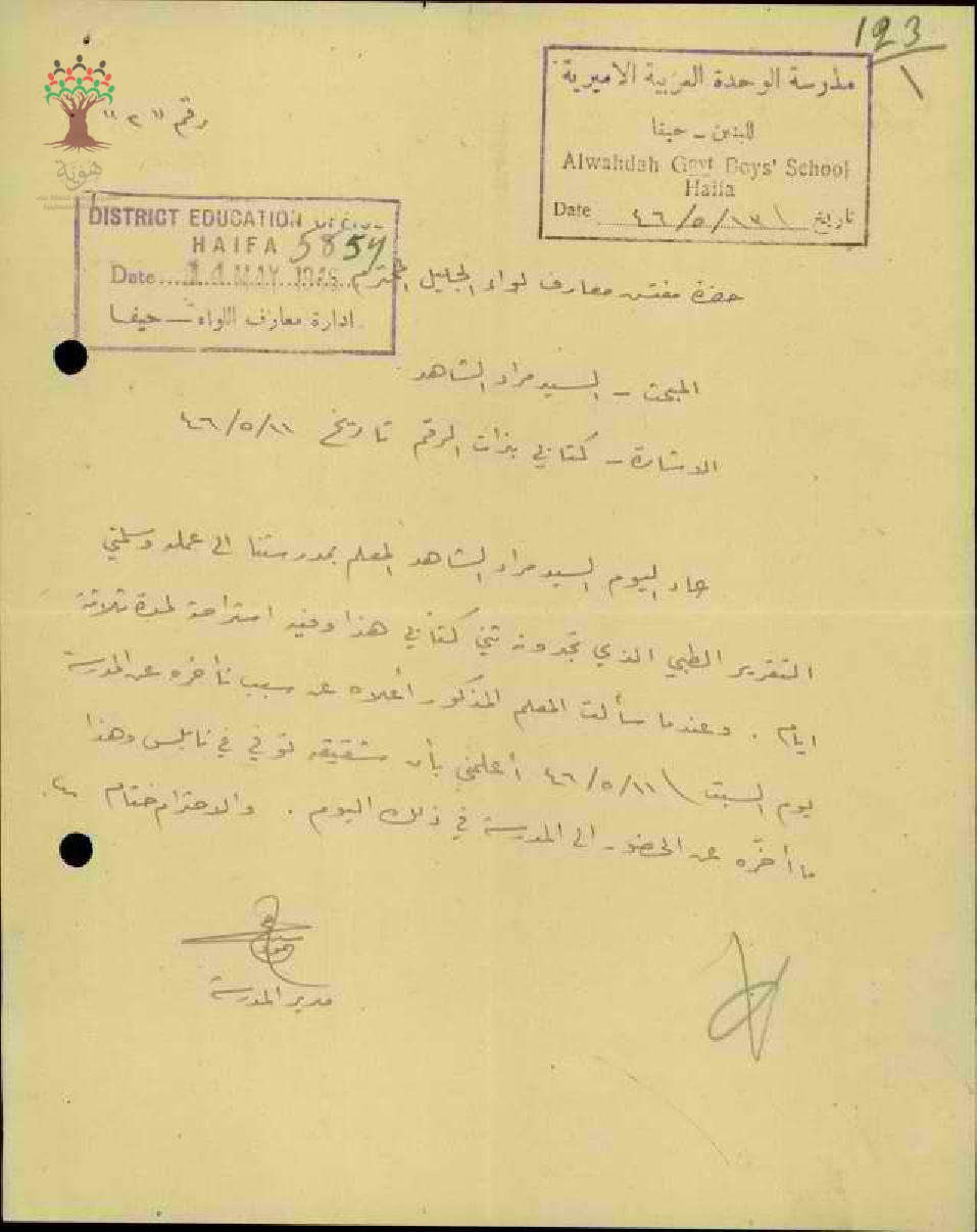 رسالة من مدير مدرسة الوحدة العربية الى مفتش المعارف بخصوص تغيب المعلم مراد الشاهد مرفقة بالتقرير الطبي وعودته الى العمل