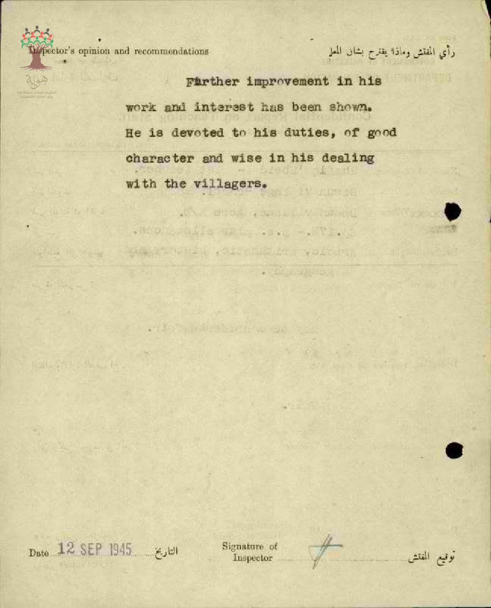 رأي المفتش العام بالمعلم شفيق سليم عبيد - عكا - مدرسة الدامون