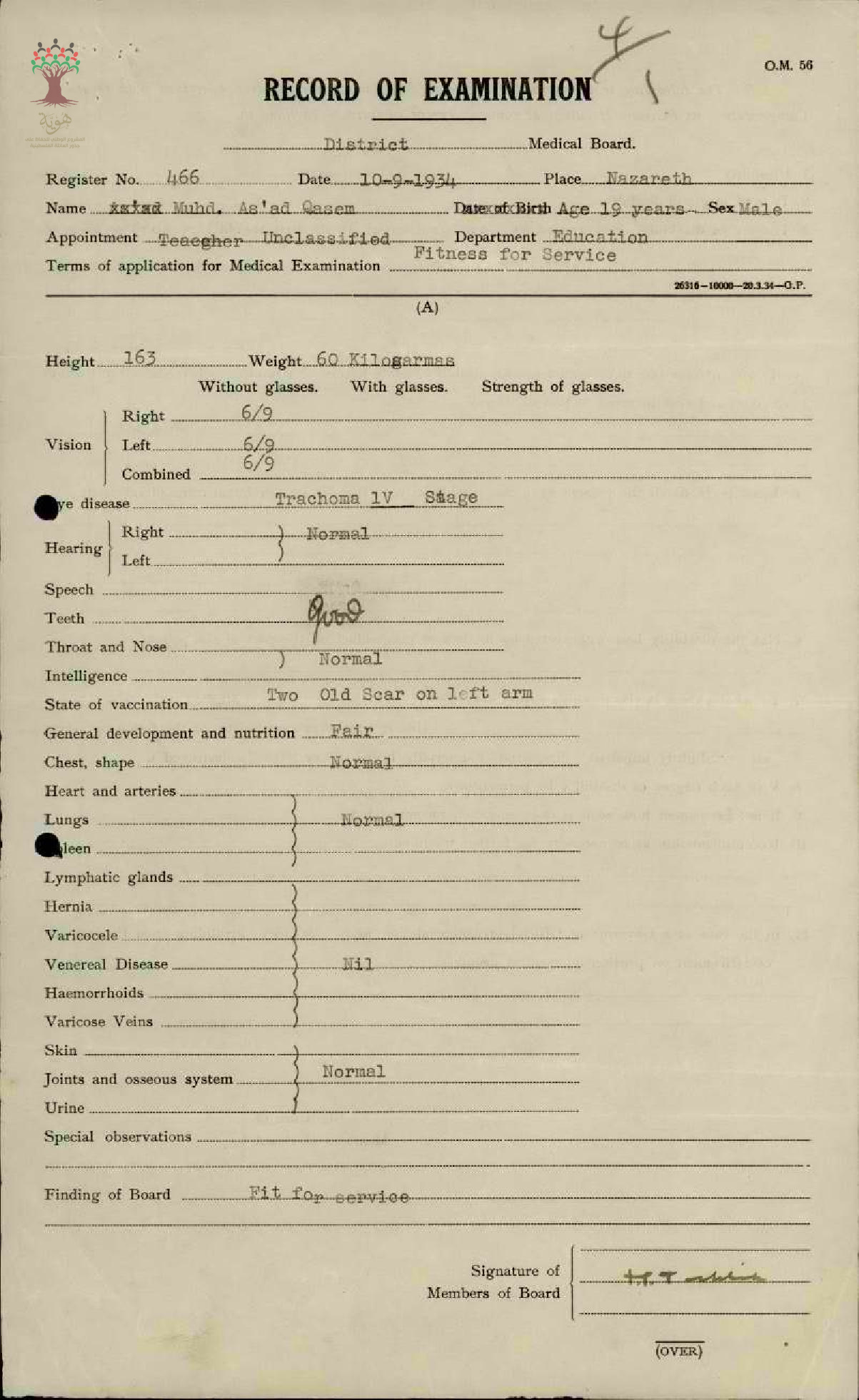 تقرير طبي لتعيين المعلم محمد قاسم في مدرسة عرابة