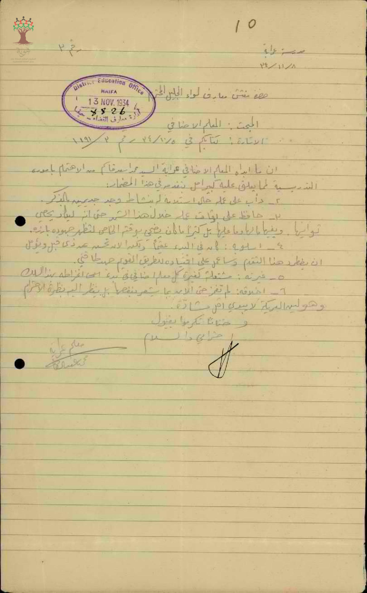 رسالة من مدير مدرسة عرابة الى مفتش المعارف بخصوص أداء المعلم محمد قاسم