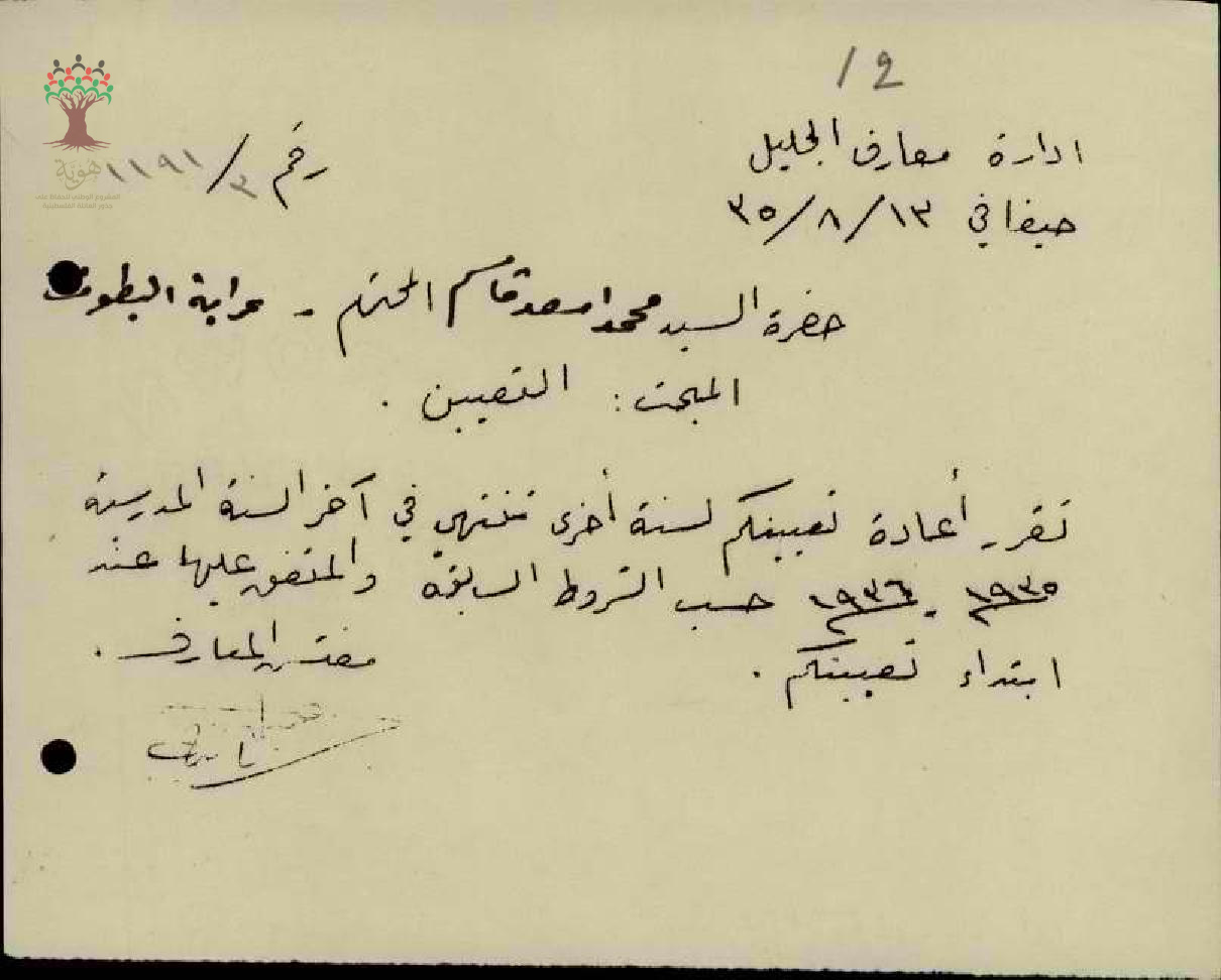 رسالة من مفتش المعارف الى المعلم محمد قاسم بخصوص اعادة تعيينه لسنة أخرى