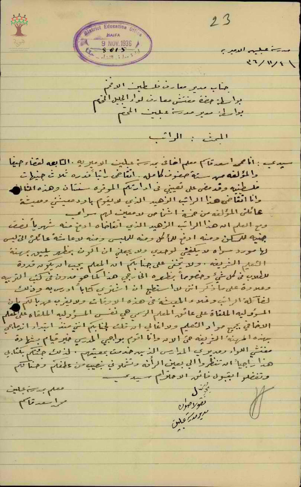 رسالة من المعلم محمد قاسم الى مفتش المعارف يطلب فيها زيادة راتبه