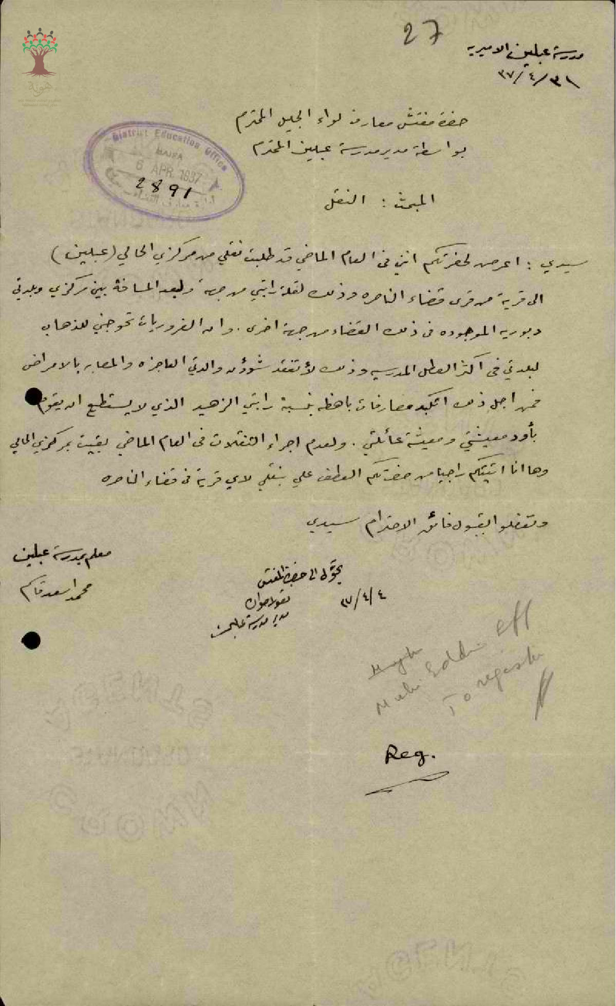 رسالة من المعلم محمد قاسم الى مفتش المعارف يطلب فيها نقله من مدرسة عبلين