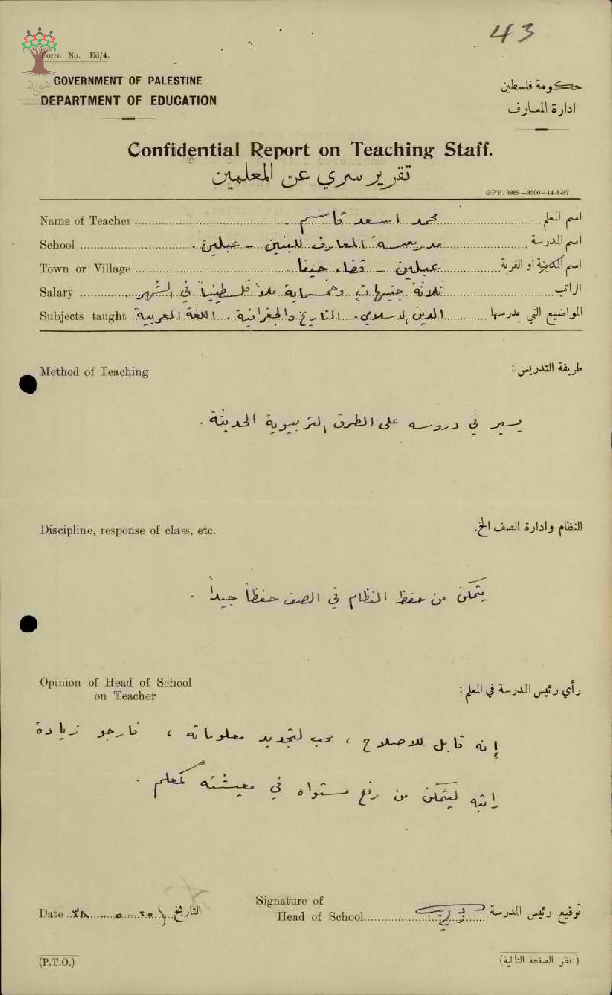 تقرير تفصيلي عن أداء المعلم محمد أسعد قاسم في مدرسة عبلين الأميرية سنة 1938
