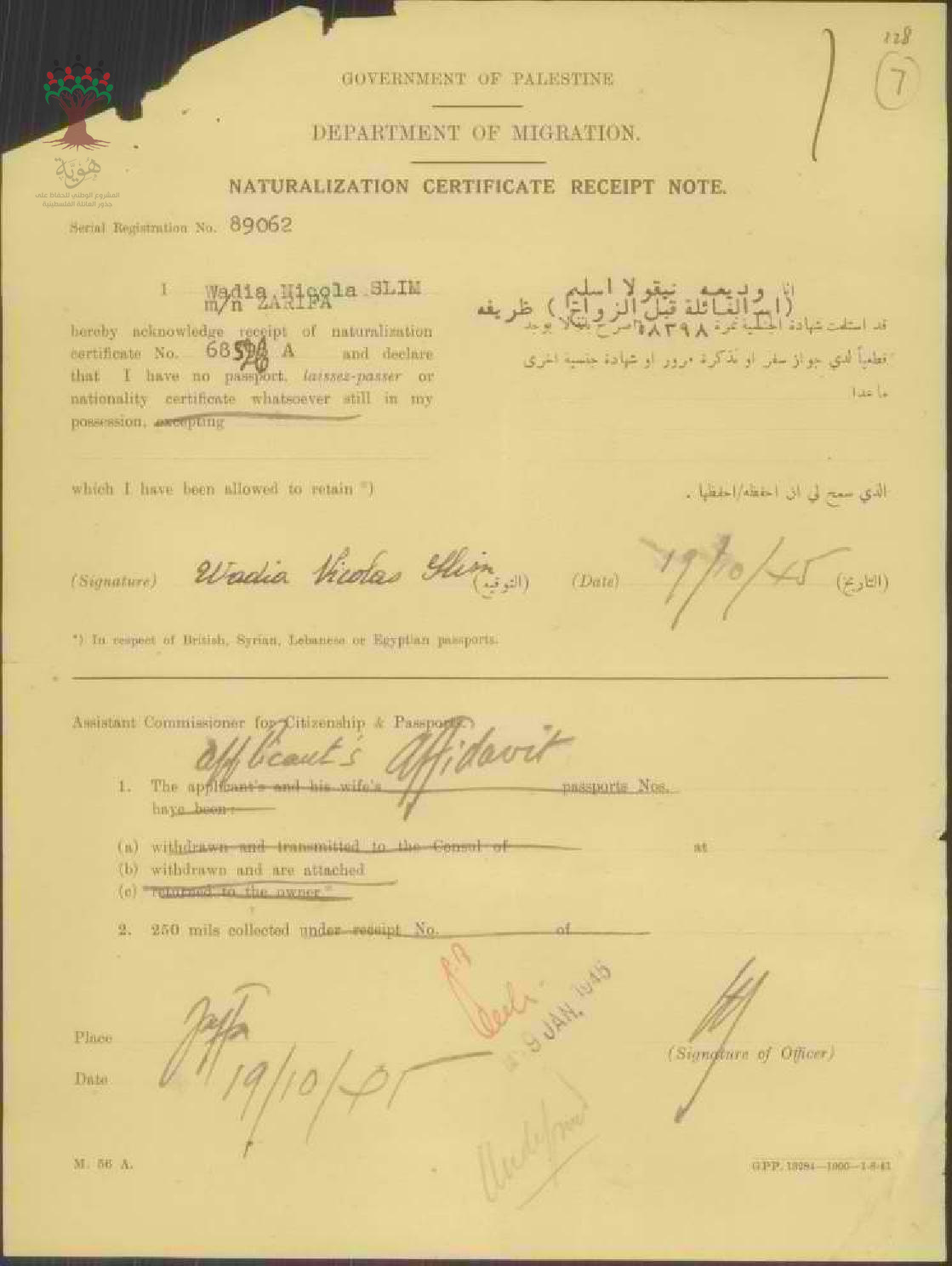 ايصال موقع من وديعة نيقولا سليم (ظريفة) باستلام شهادة الجنسية الفلسطينية