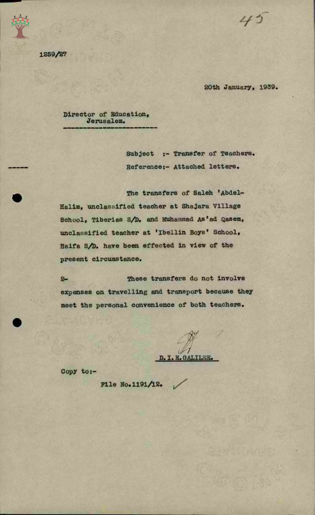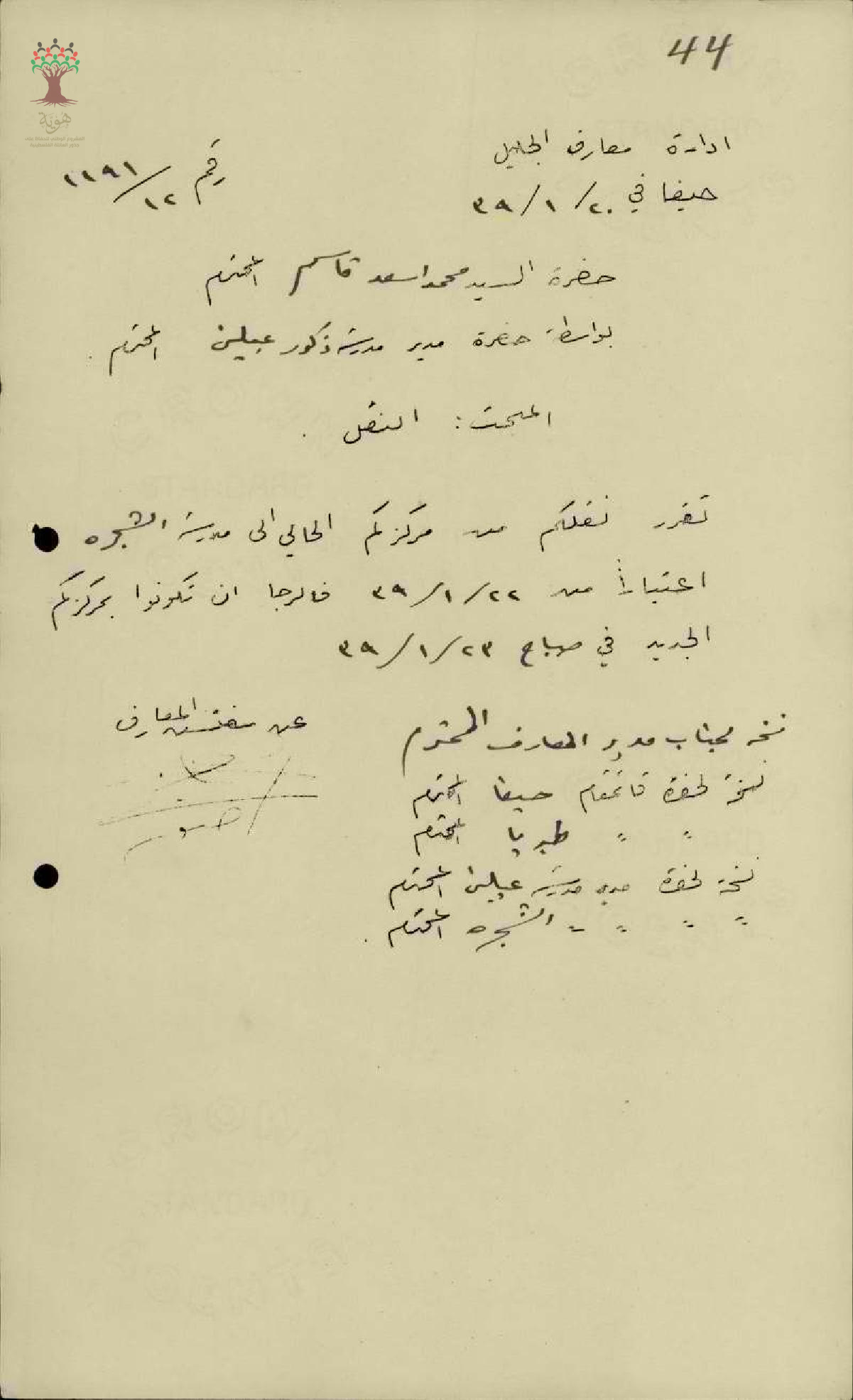 رسائل بخصوص نقل المعلم محمد قاسم من مدرسة عبلين الى مدرسة الشجرة