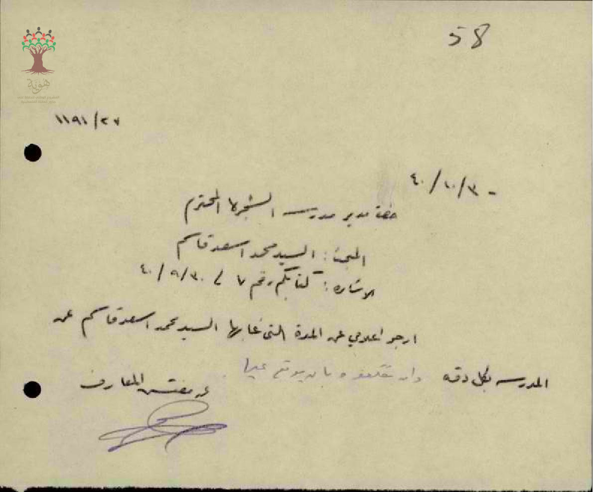 رسالة من مفتش المعارف الى مدير مدرسة الشجرة يسأل عن موعد عودة المعلم محمد قاسم الى العمل